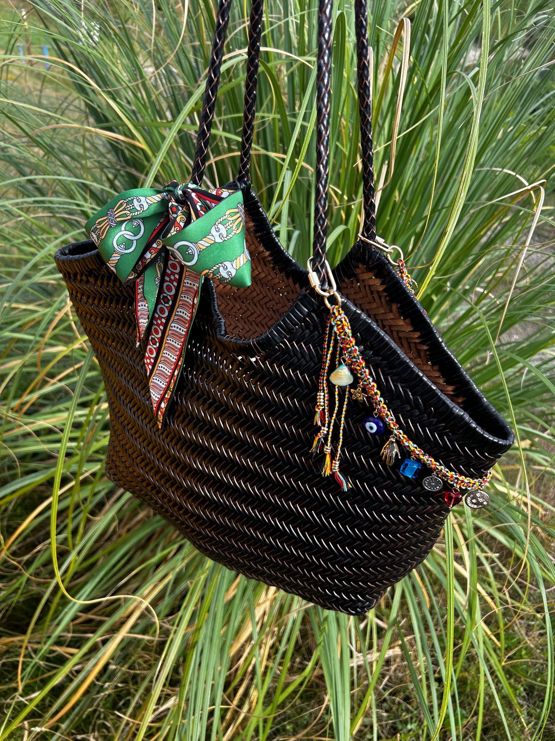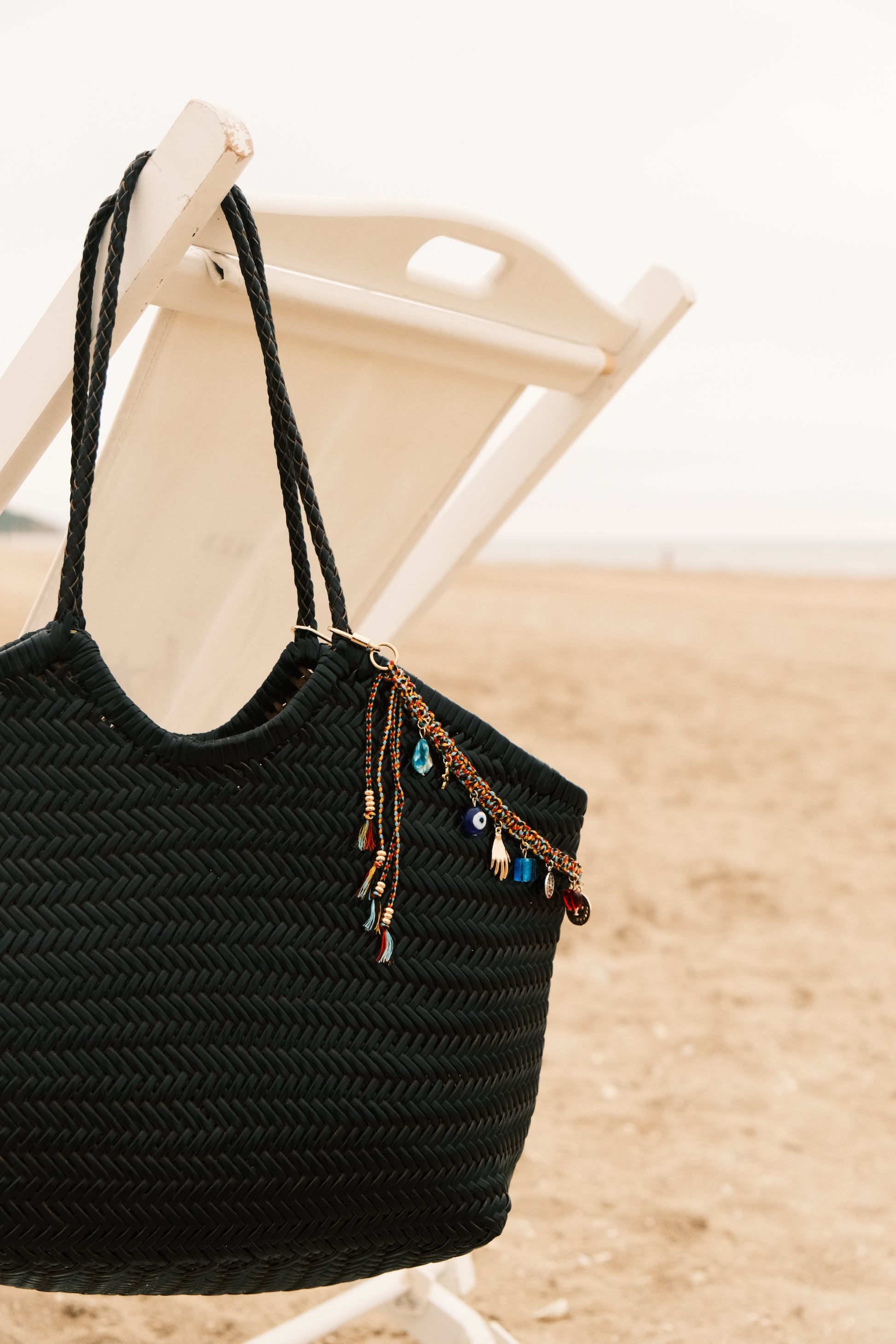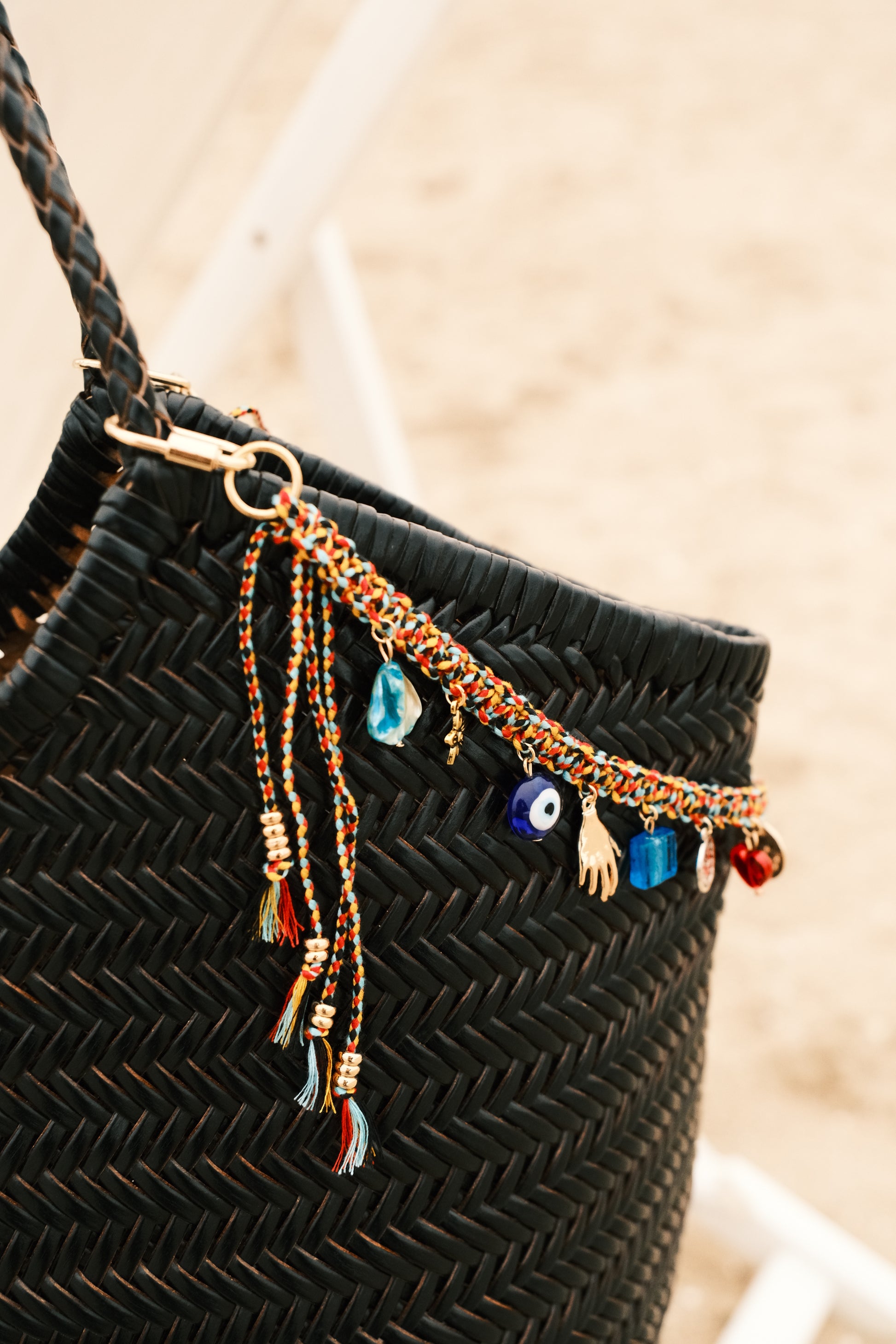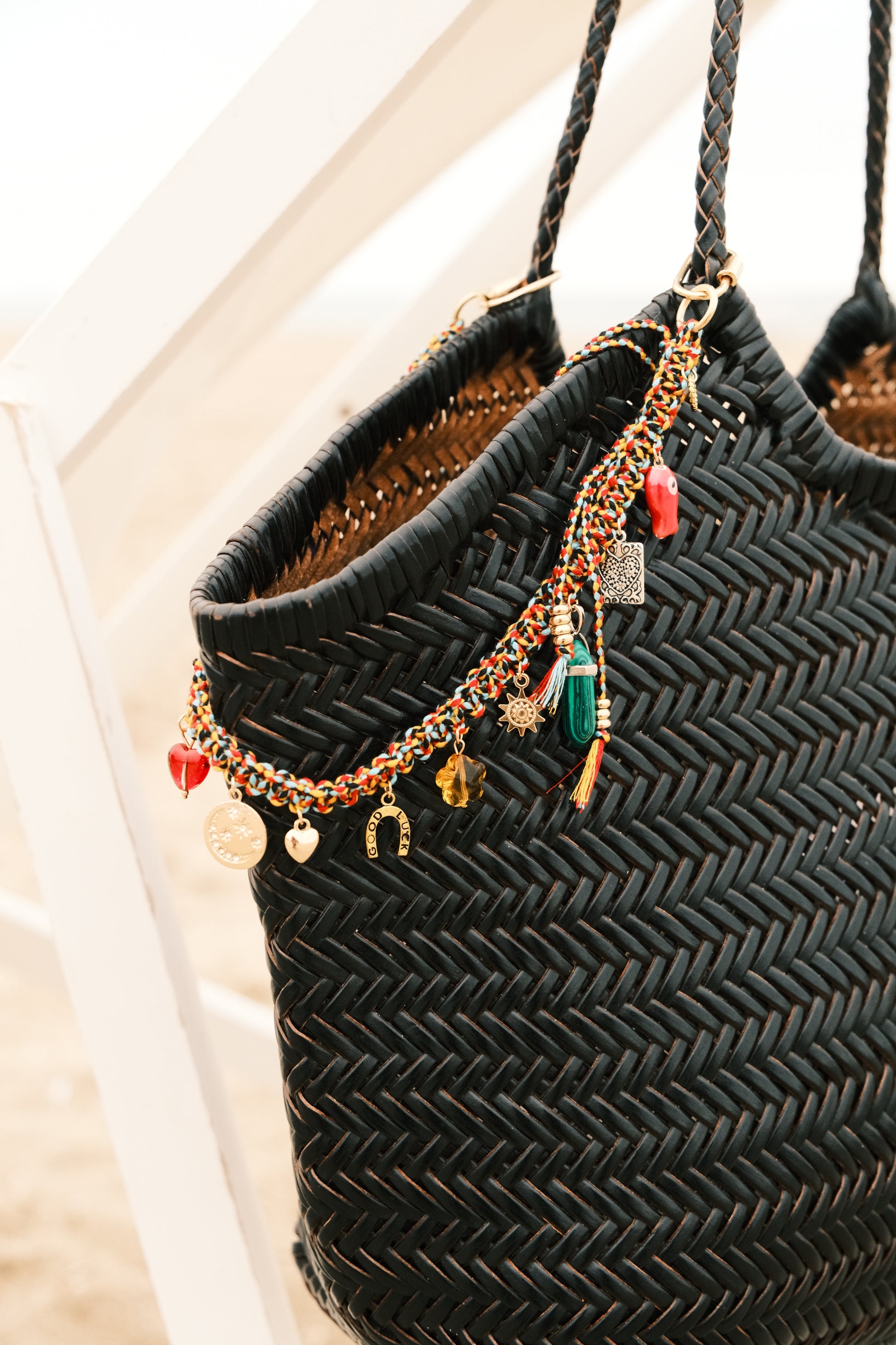 Fait main avec soin, ce bijou de sac unique transforme instantanément votre panier ou cabas en un accessoire vibrant et stylé. Tissé avec un fil multicolore et orné de breloques porte-bonheur (main, œil, pierre, cœur…), il vous suit partout, du marché à la plage.