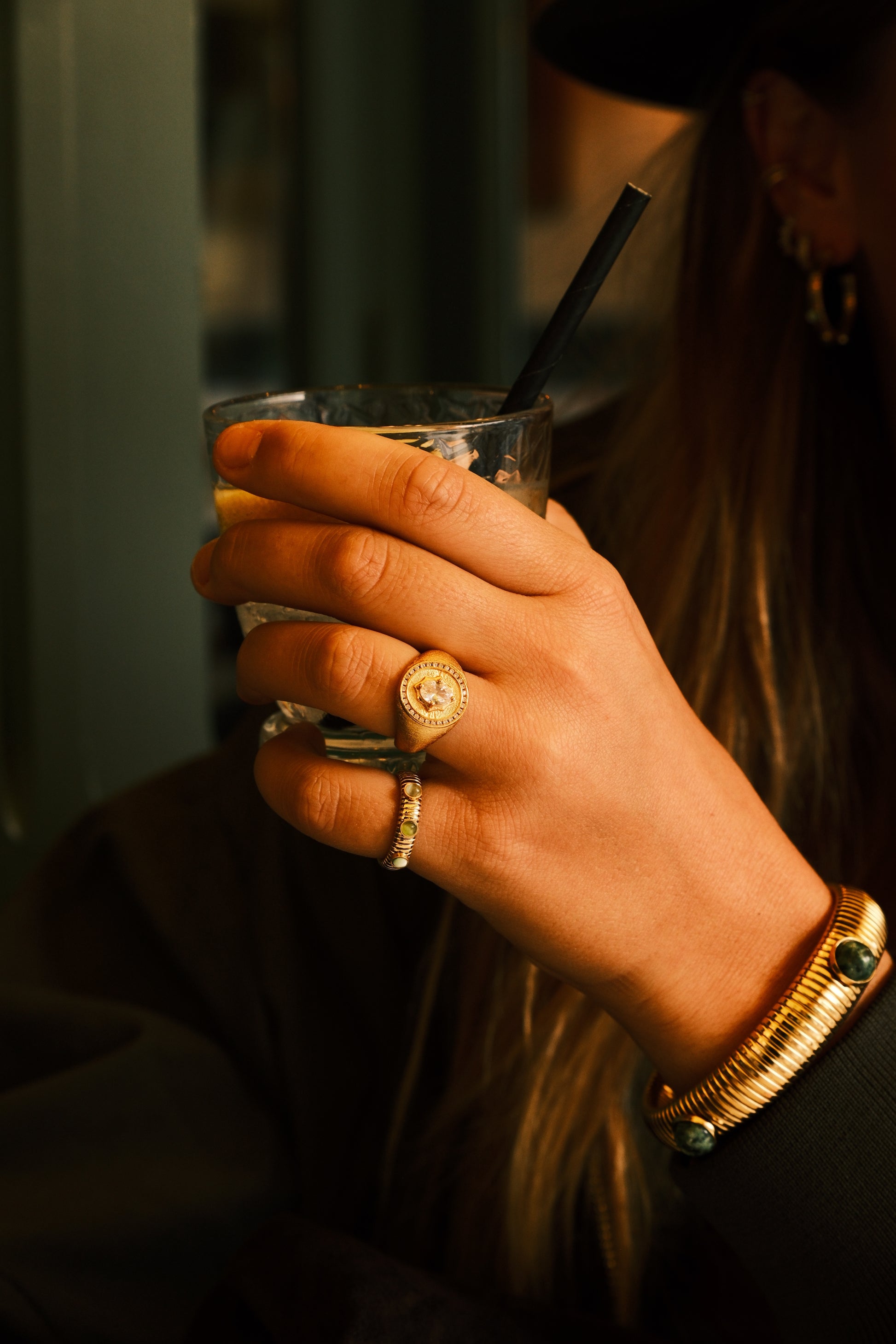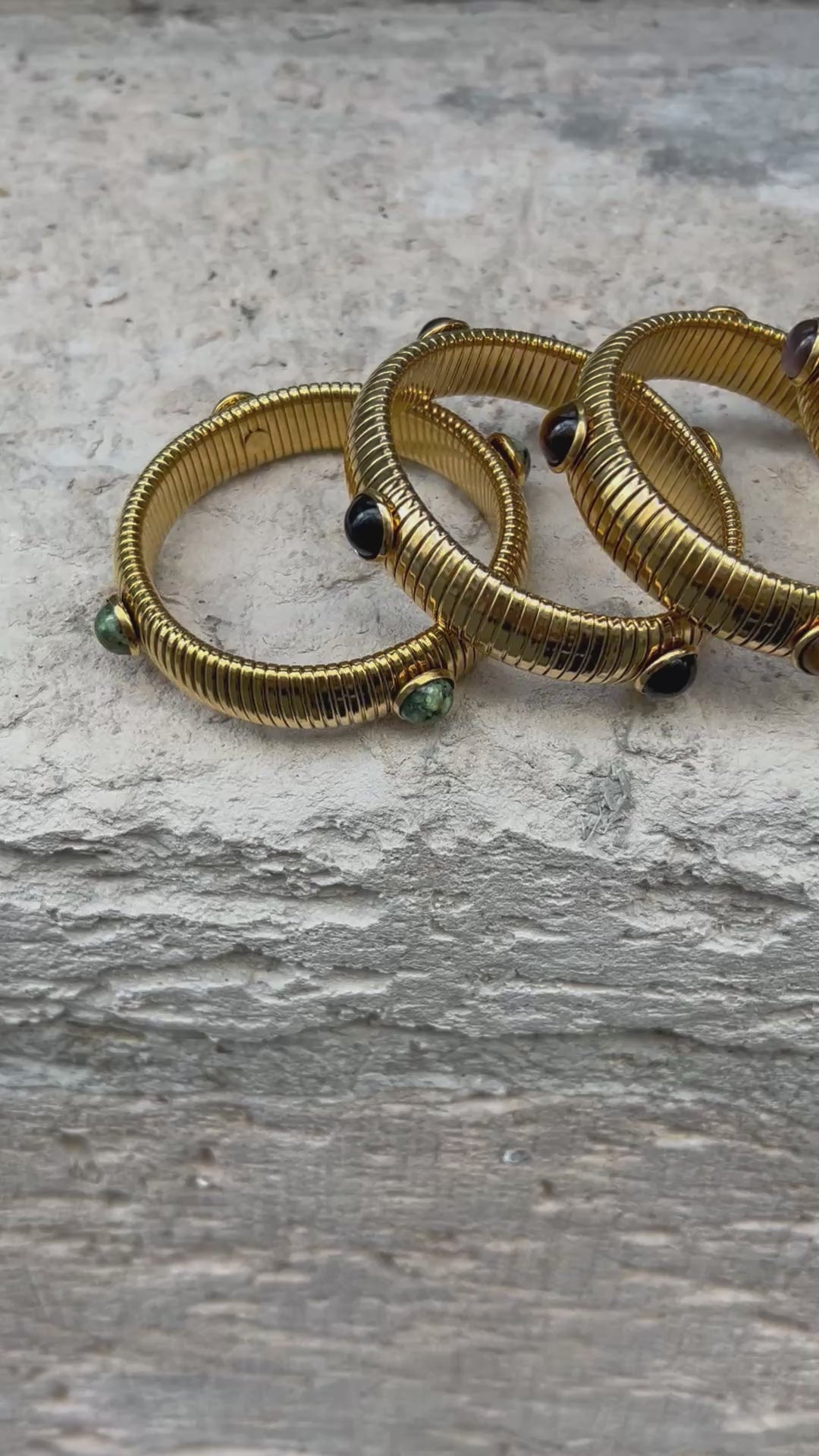 Le bracelet Solea est une pièce forte et élégante qui capte la lumière à chaque mouvement. Son design raffiné en métal doré est sublimé par des pierres aux nuances éclatantes, disponibles en vert, noir, marron et corail/rose.
