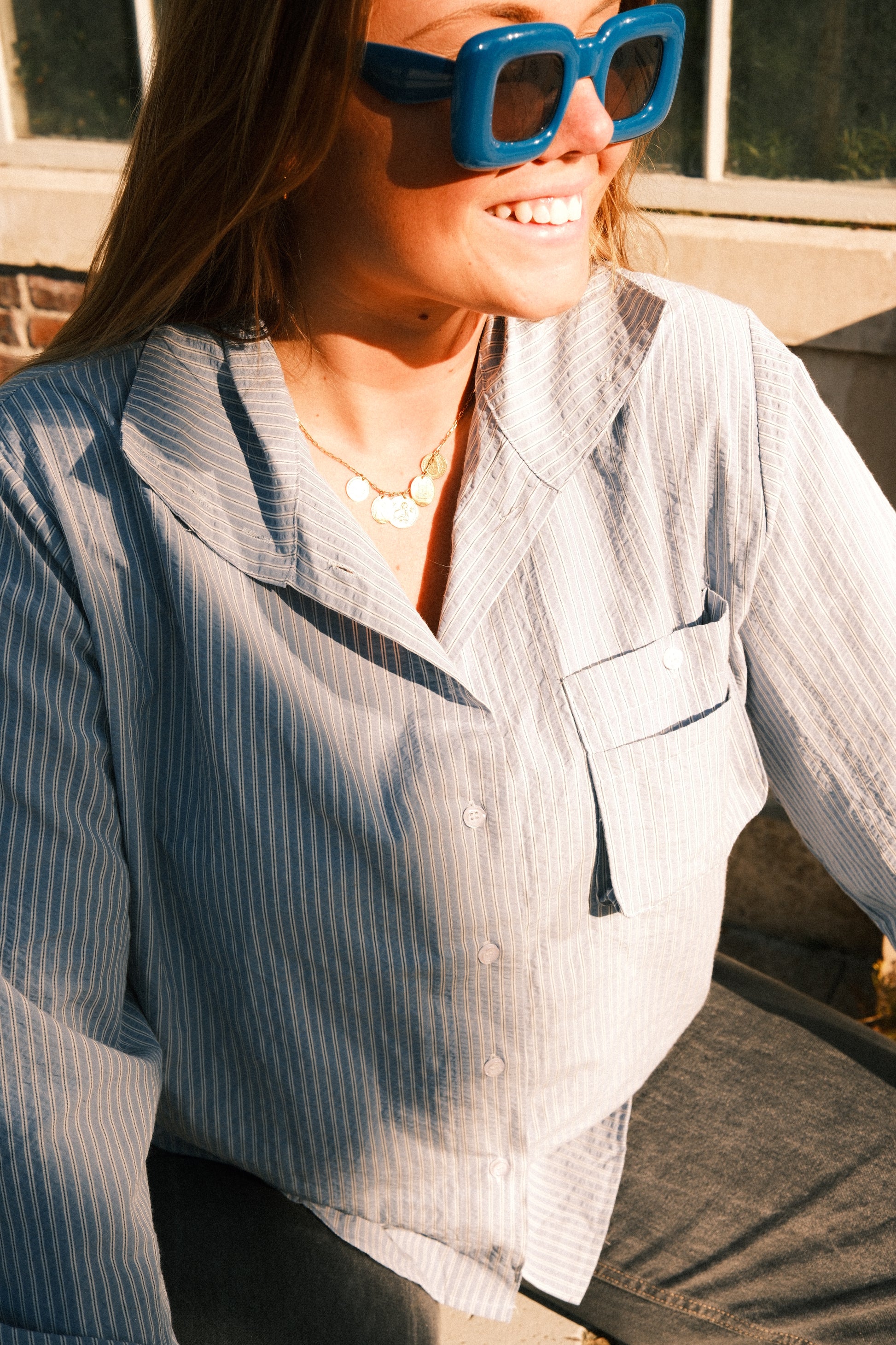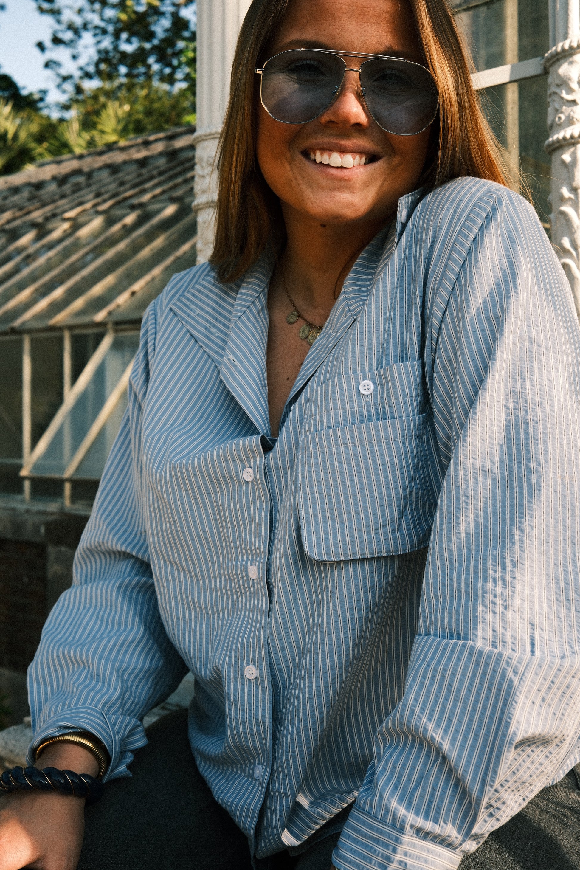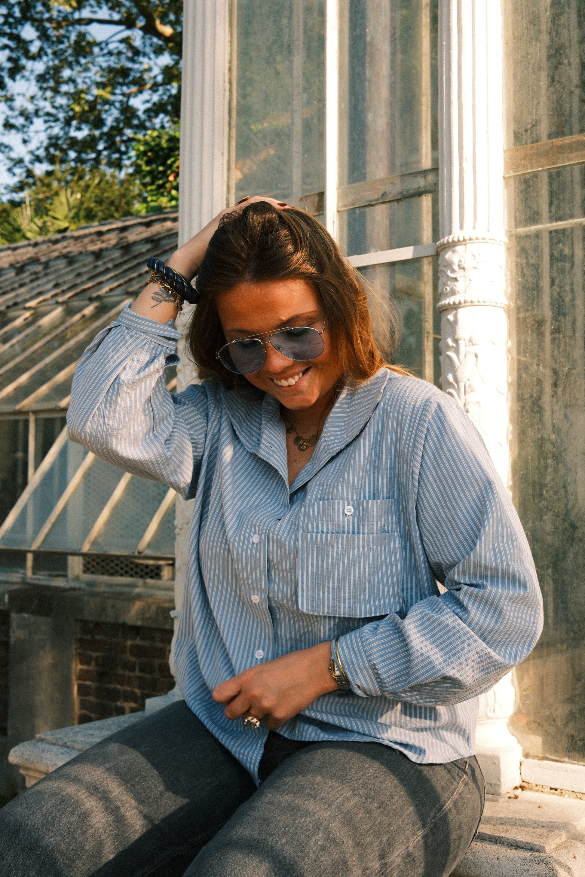Notre chemise bleu rayée revisite un grand classique avec une touche de modernité assumée. Confectionnée en coton fluide et agréable, elle se distingue par sa poche en relief qui ajoute du volume et du caractère à la silhouette.