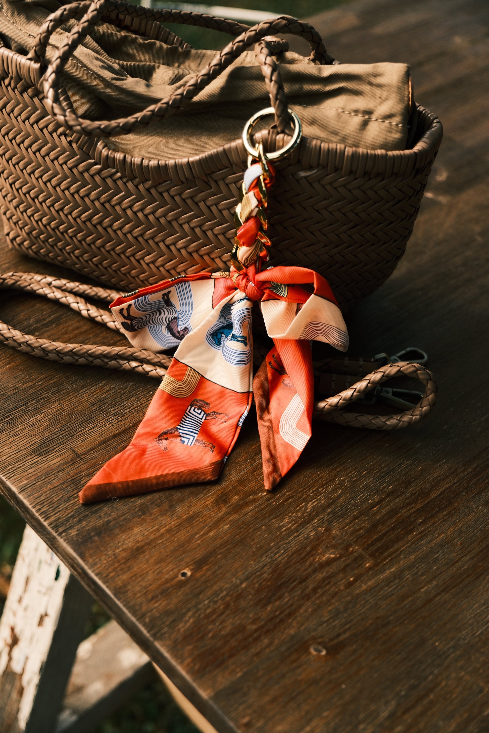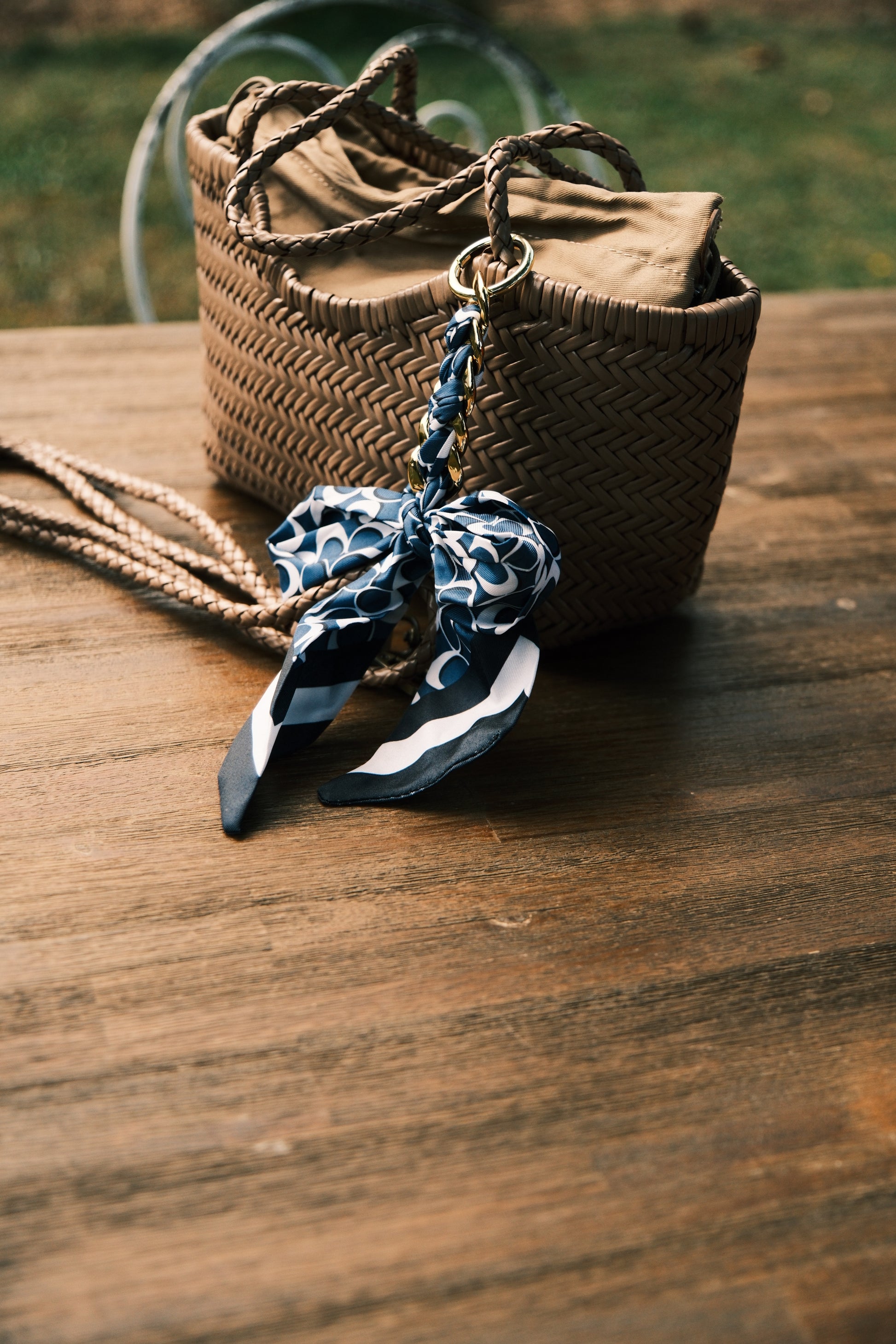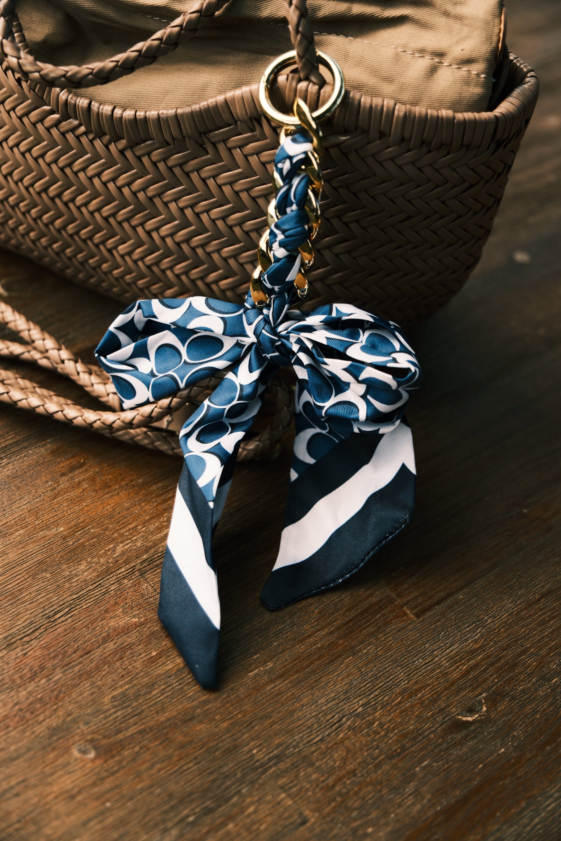 Son design raffiné allie une chaîne dorée tressée et un foulard en soie noué, pour sublimer vos sacs ou vos clés.