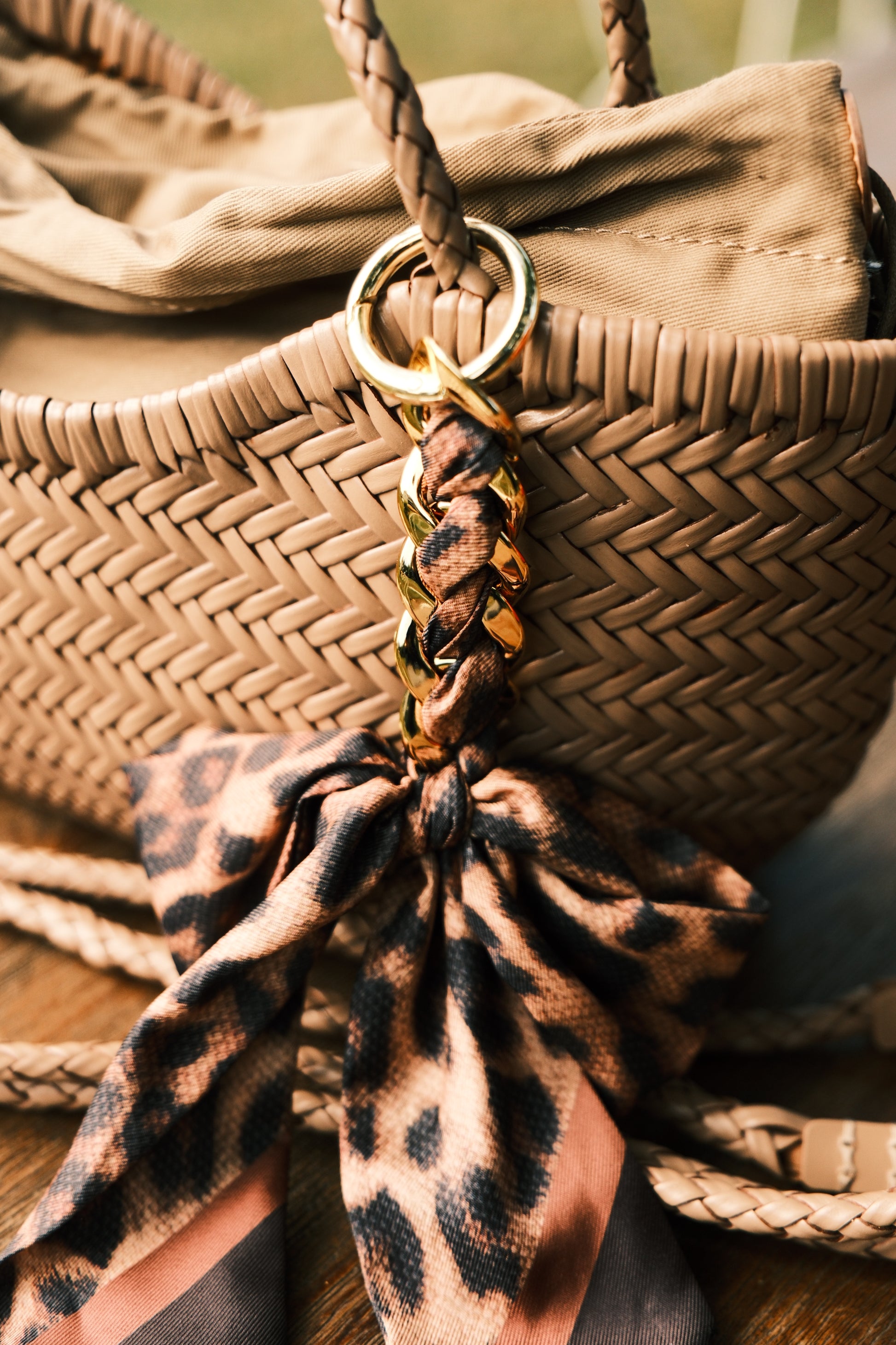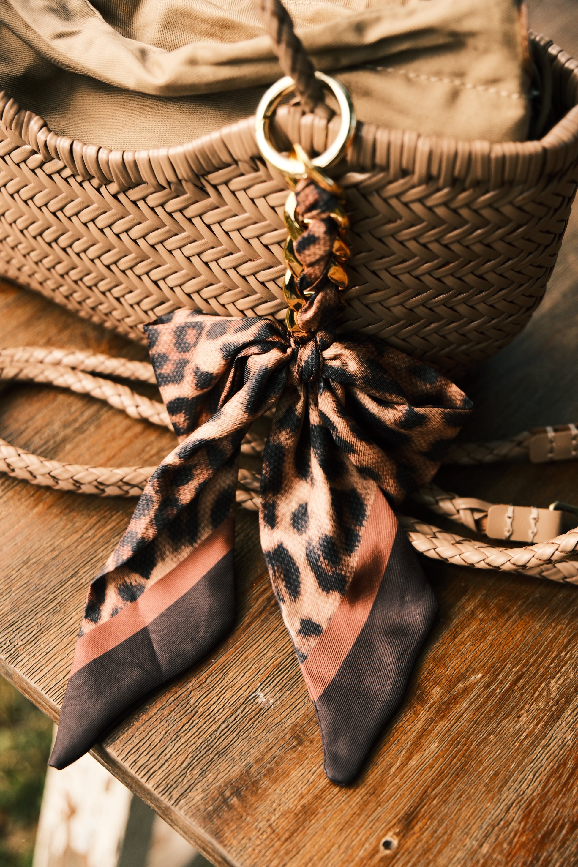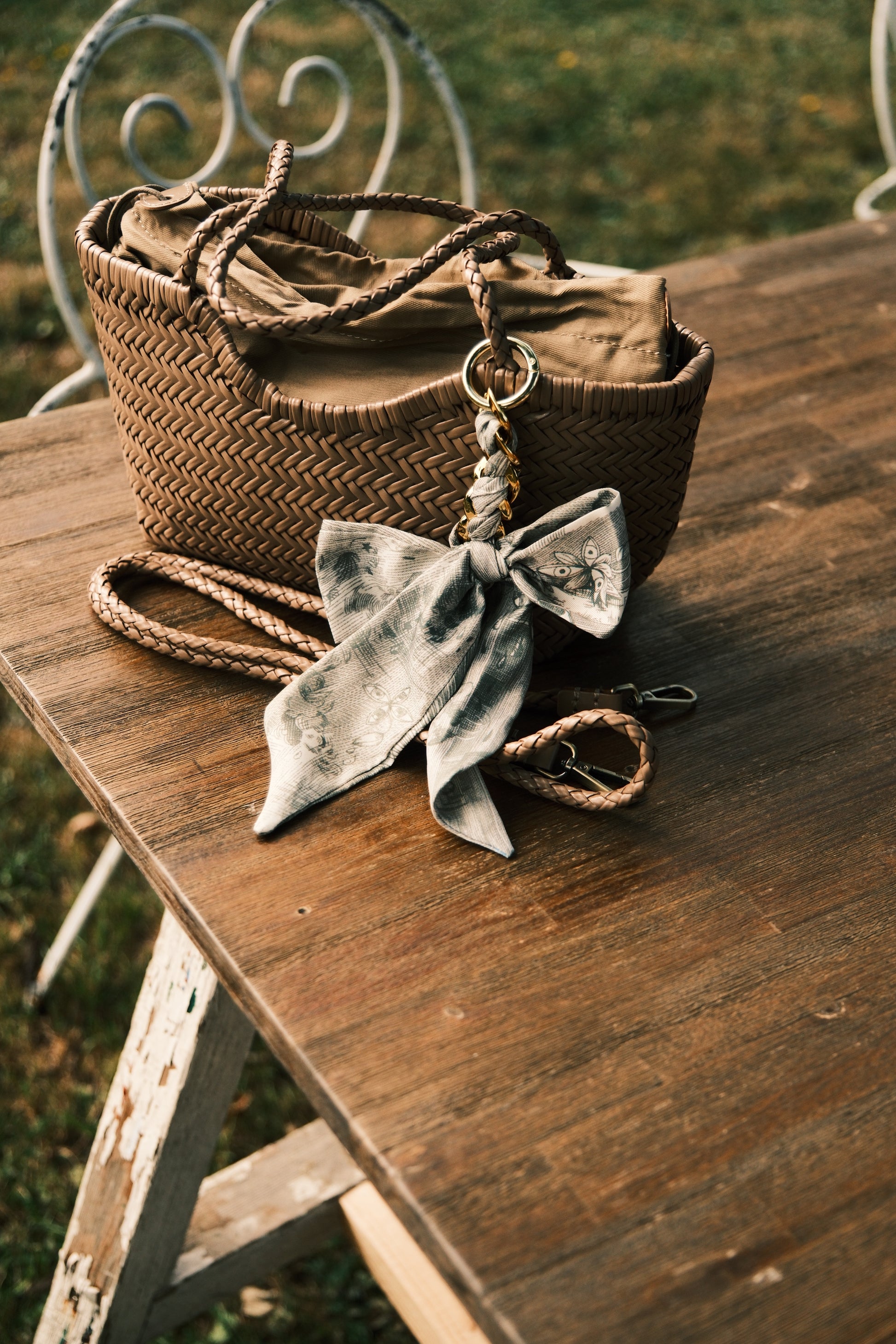 Son design raffiné allie une chaîne dorée tressée et un foulard en soie noué, pour sublimer vos sacs ou vos clés.