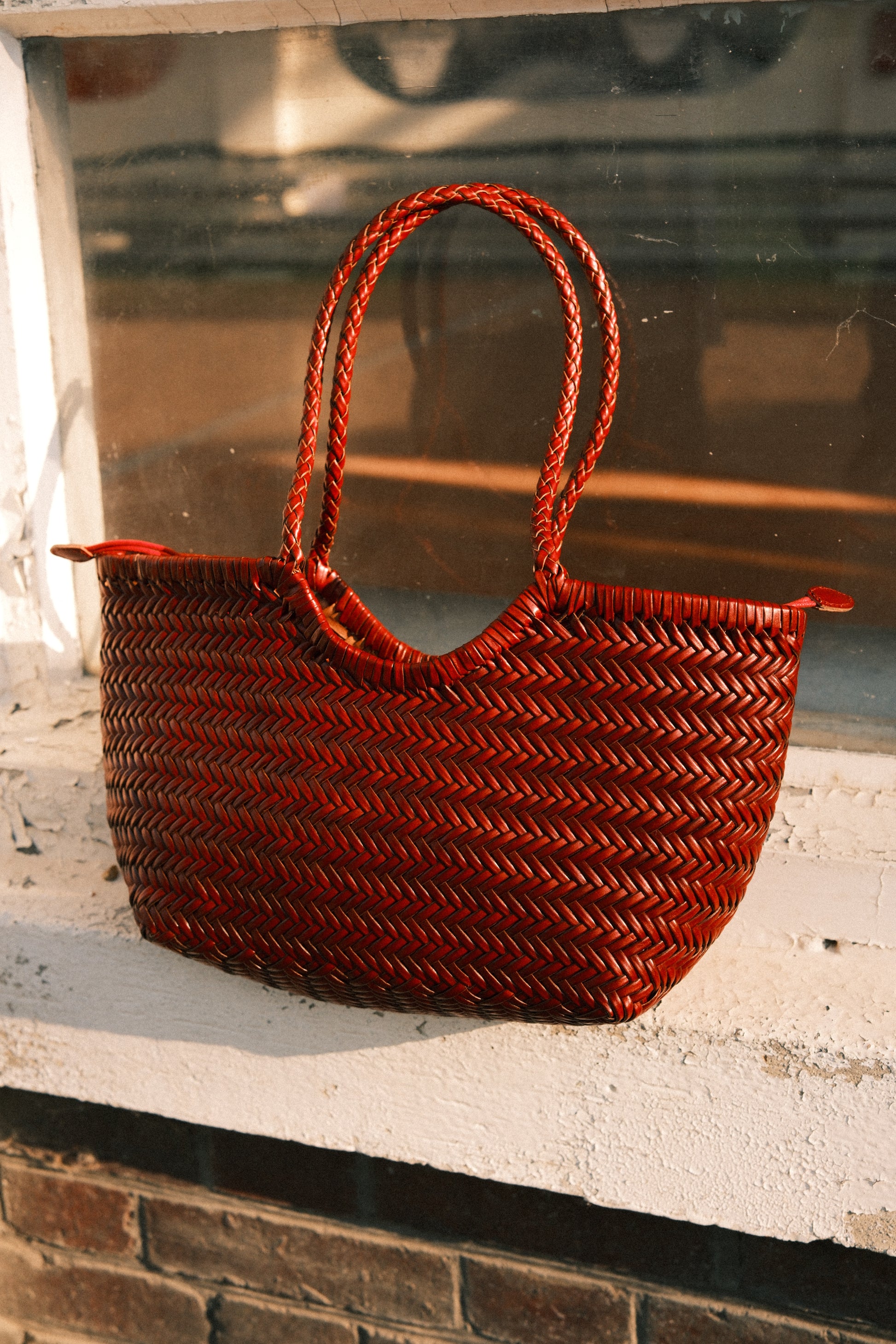 Ce panier tressé en cuir souple, aussi élégant que pratique, se porte sur l'épaule ou à la main avec sa anse tressée.