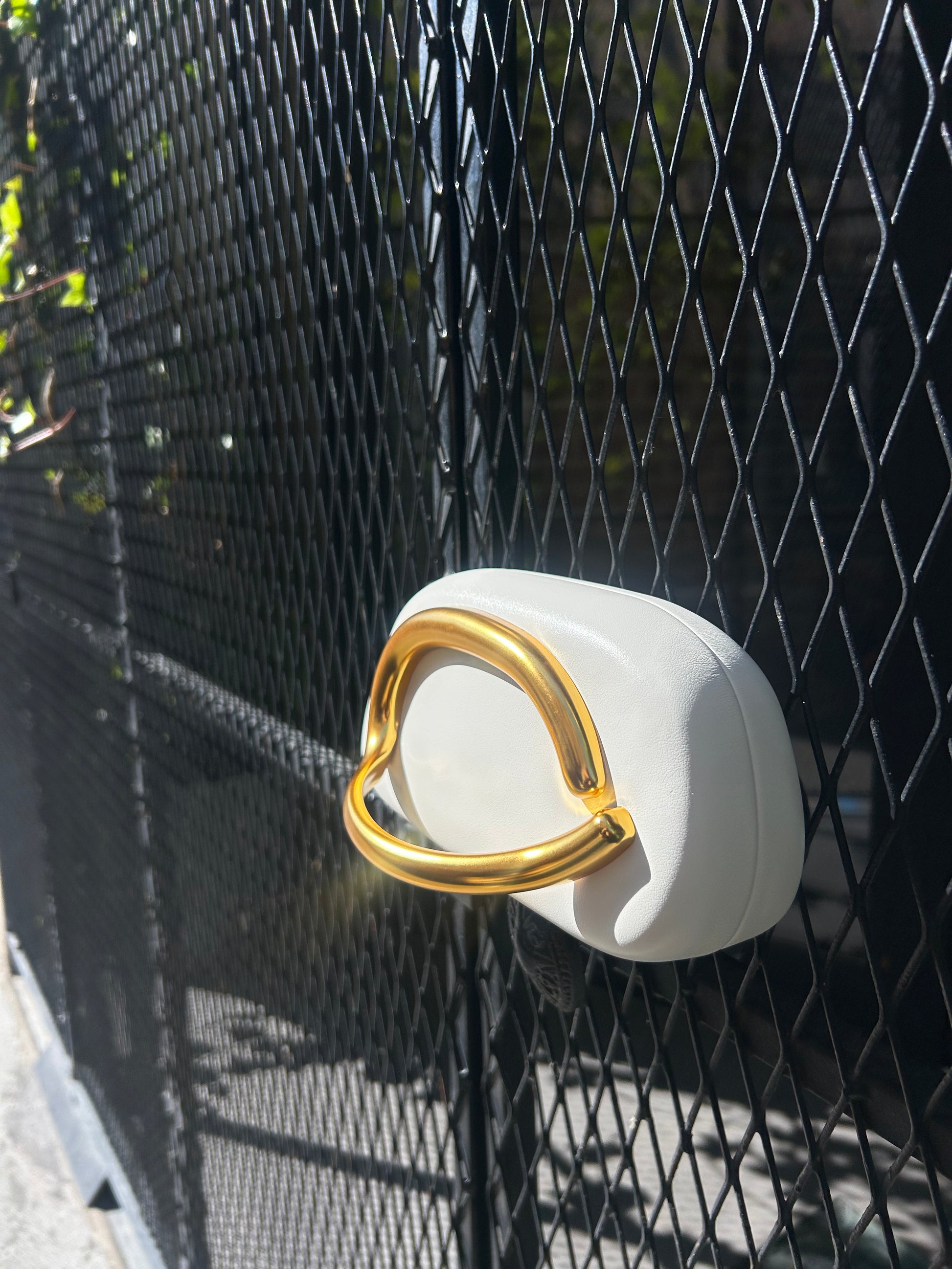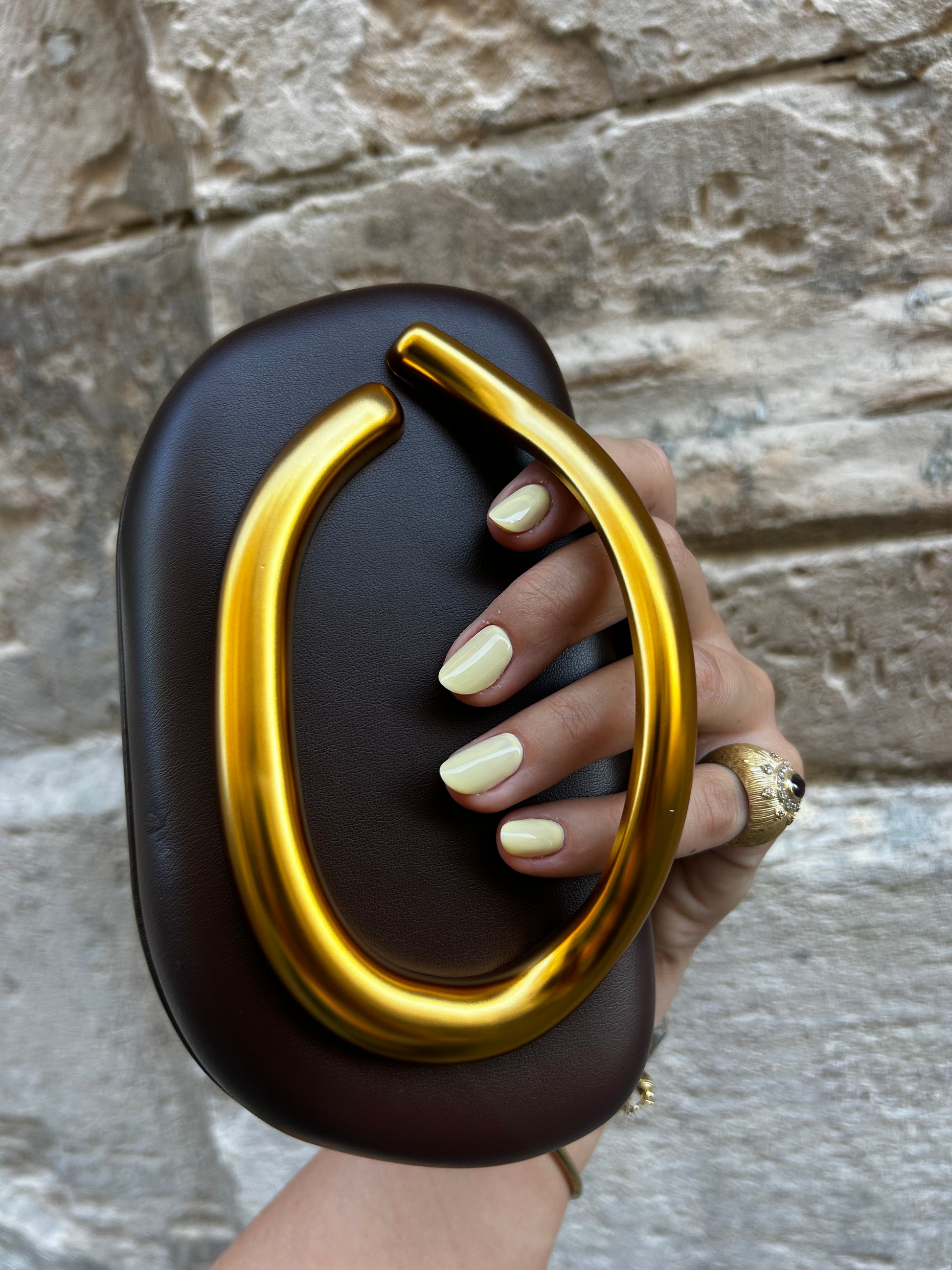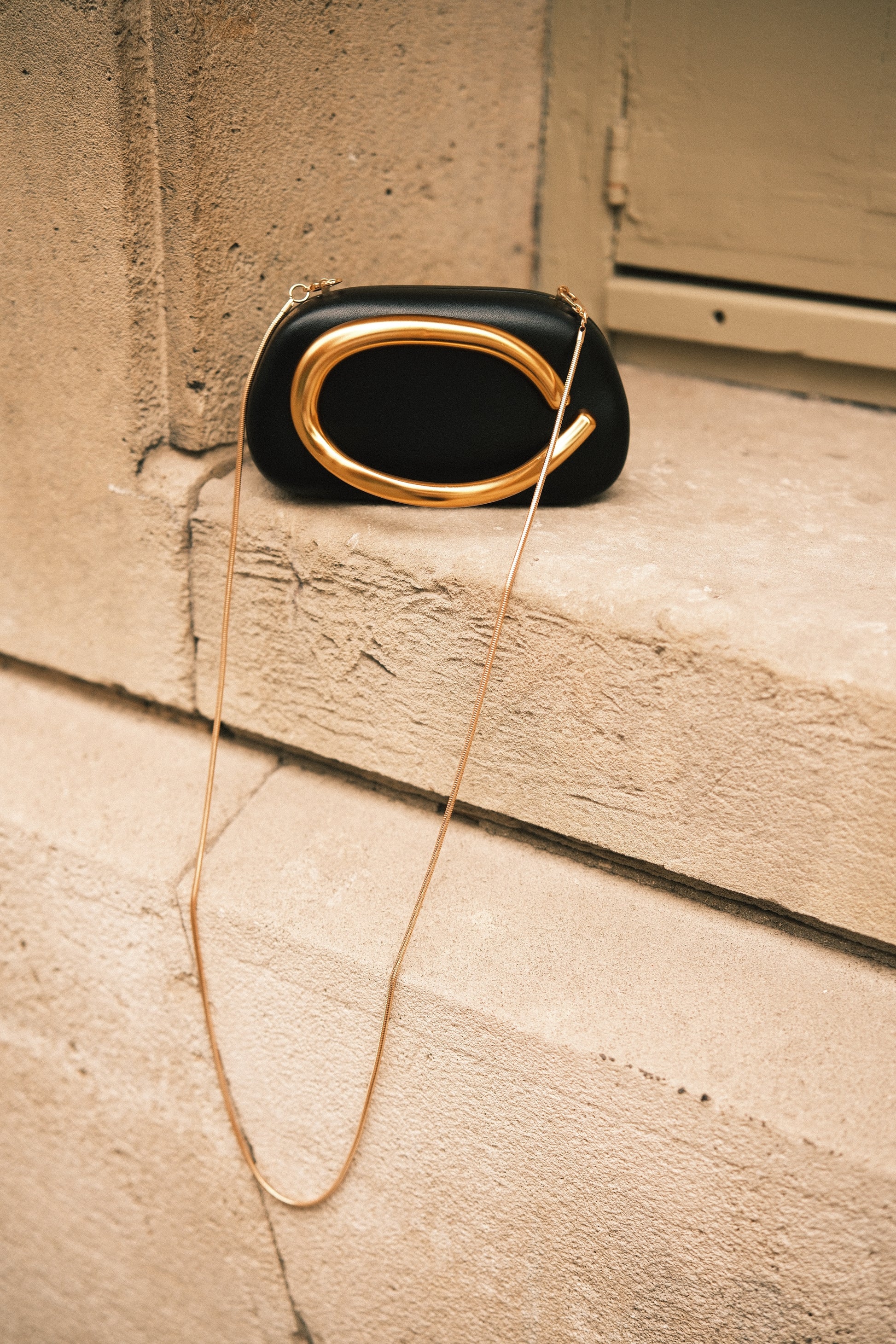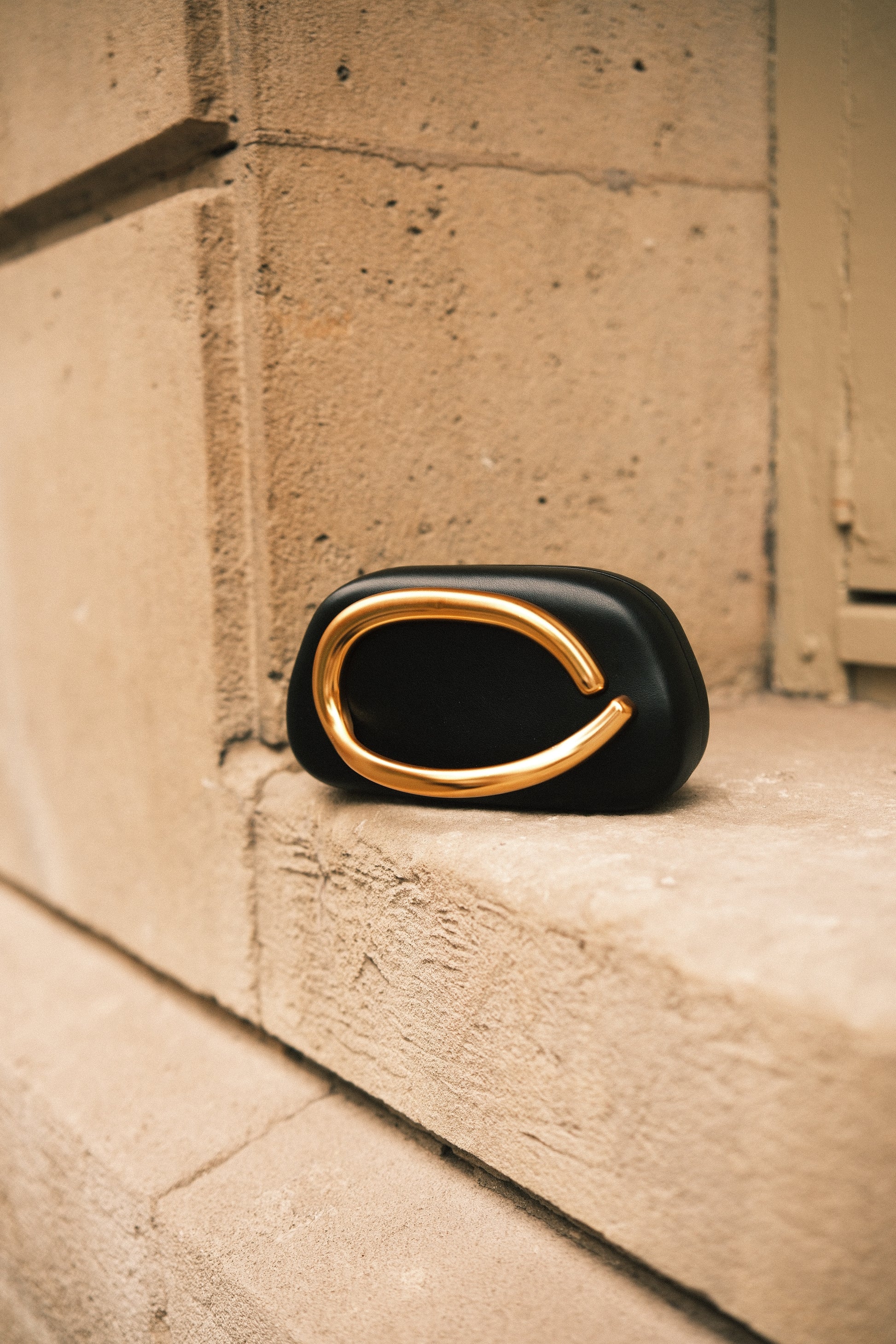 La pochette Divine incarne l’équilibre parfait entre modernité et intemporalité. Conçue en cuir rigide de haute qualité, elle se distingue par sa structure minimaliste et son bijou doré signature, à la fois audacieux et raffiné.