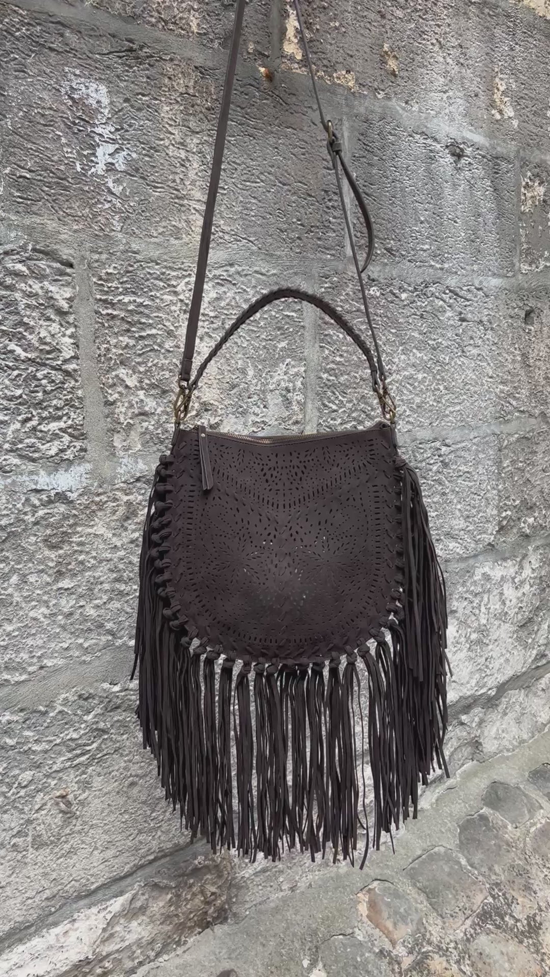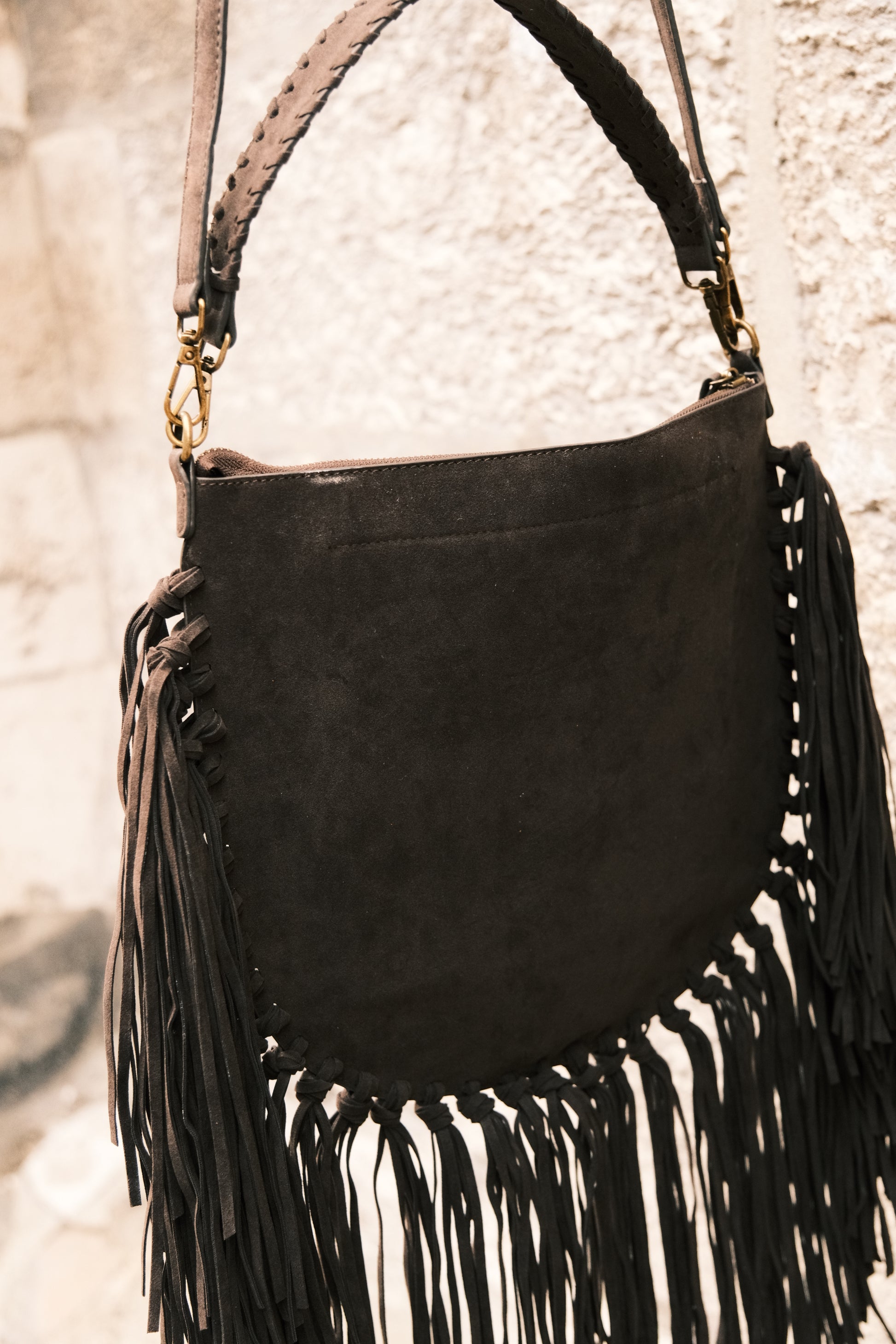 Entièrement confectionné en Italie dans un daim d’exception, le Joy se distingue par ses broderies réalisées à la main et ses superbes franges, ultra-tendance cette saison. Pratique et spacieux, il se ferme par une fermeture éclair et s’adapte à toutes vos envies : porté à l’épaule grâce à sa magnifique anse travaillée, ou en bandoulière avec sa sangle en daim assortie.
