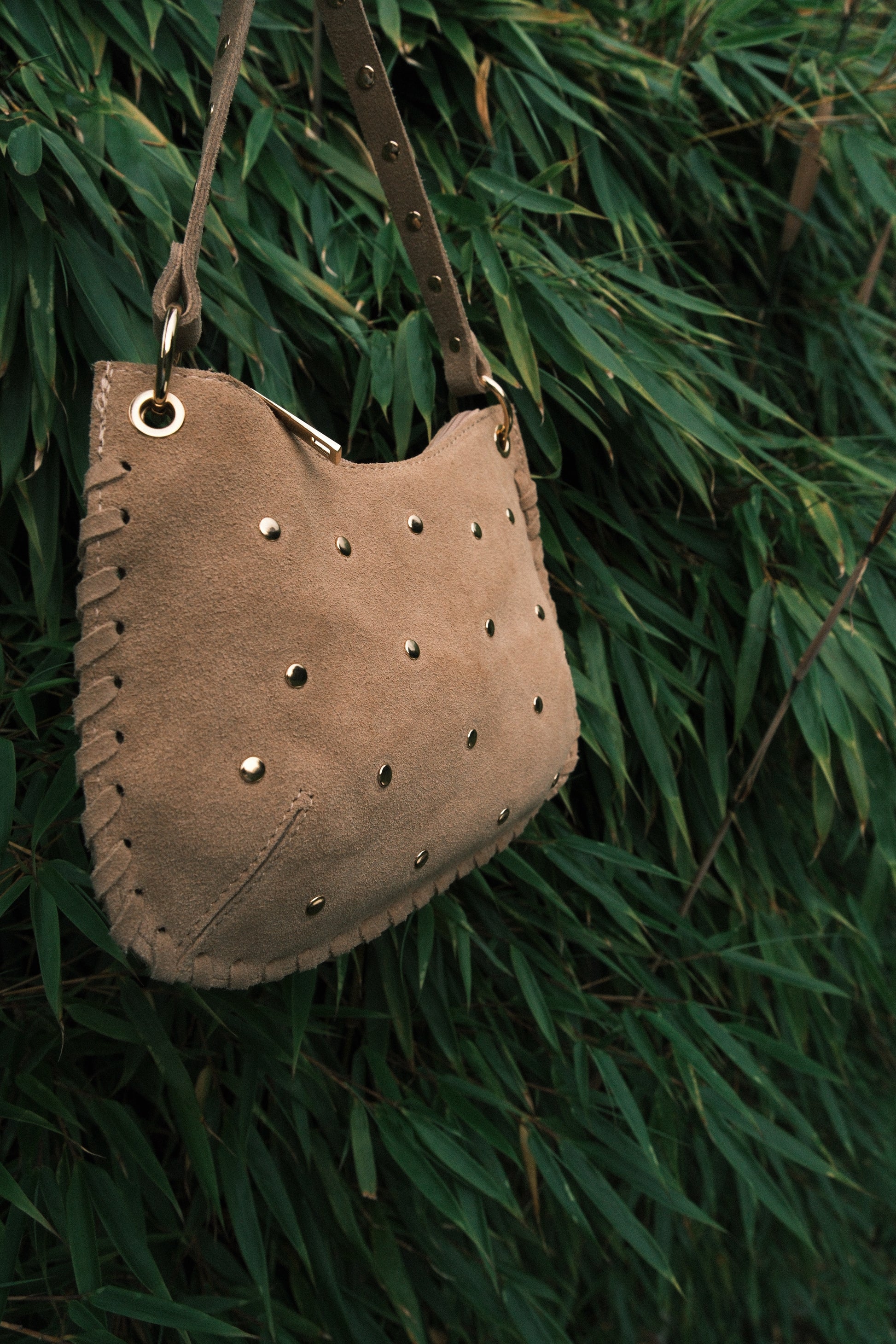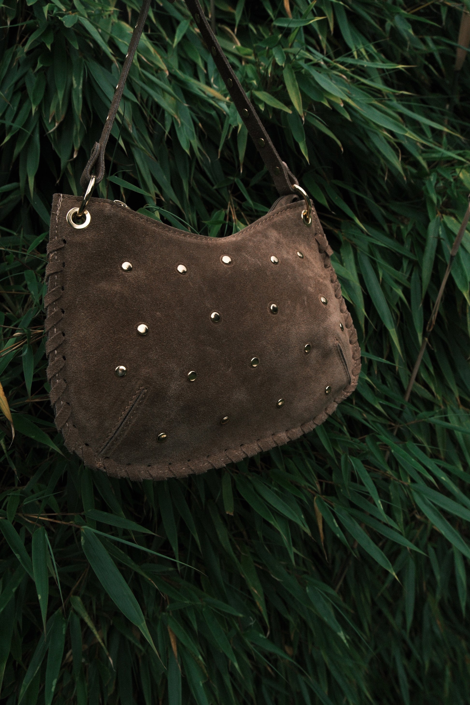 Le sac Léone en cuir suédé s’impose comme l’allié de caractère de vos tenues. Son cuir texturé aux teintes chaudes s’orne de délicats clous dorés pour une touche à la fois rock et raffinée. Sa silhouette souple et sa bandoulière ajustable permettent un porté épaule ou main, selon vos envies.