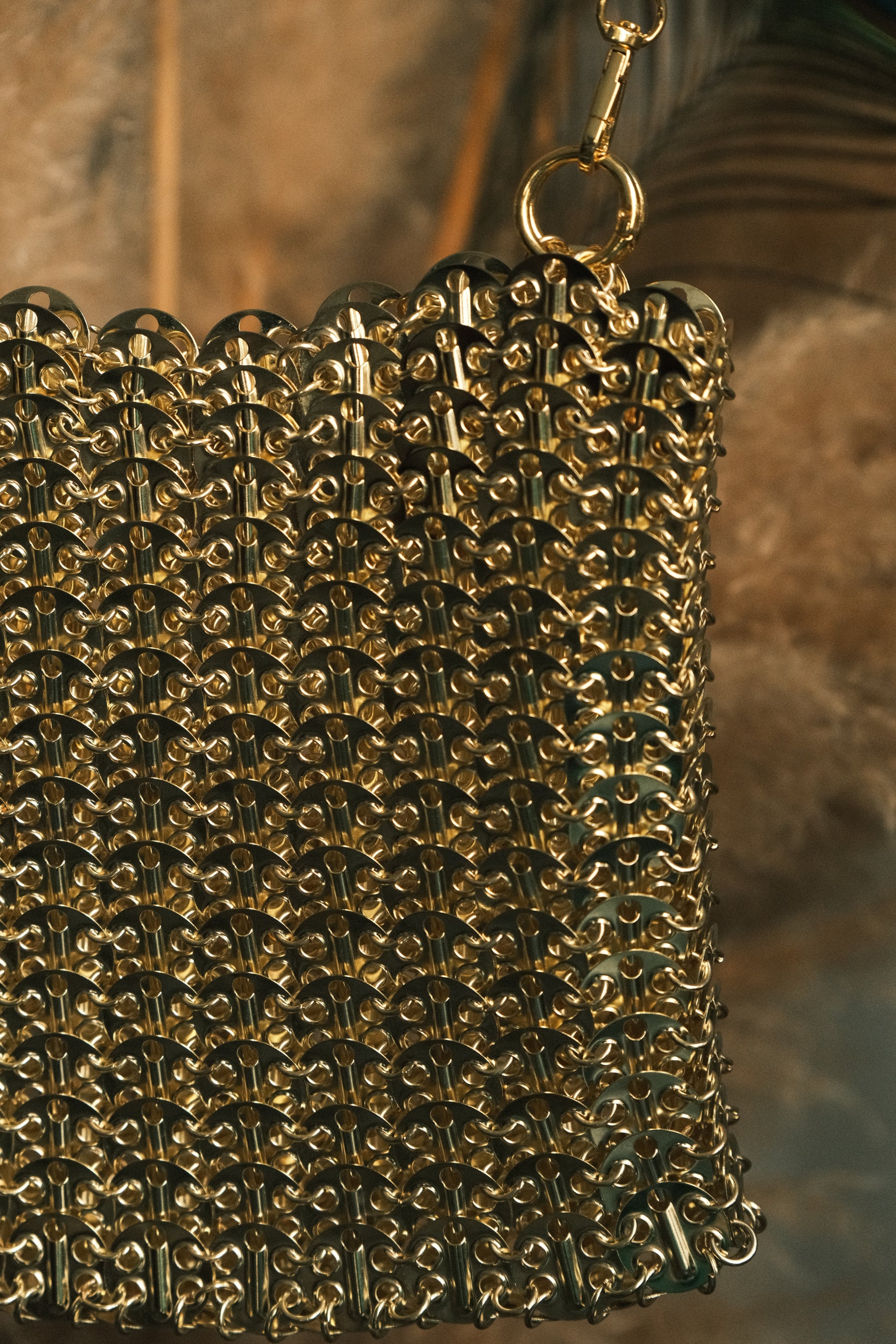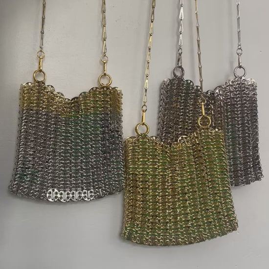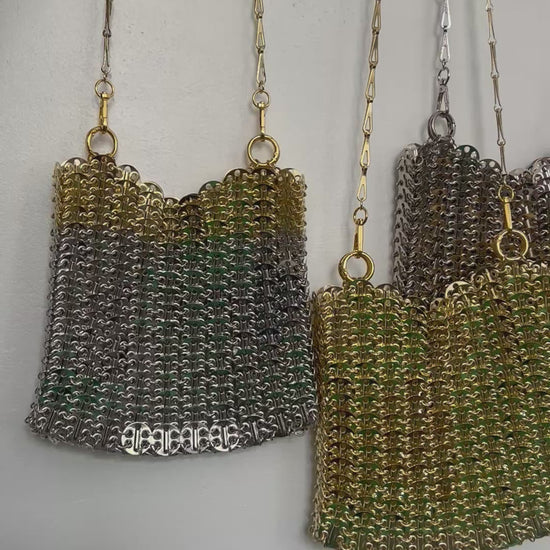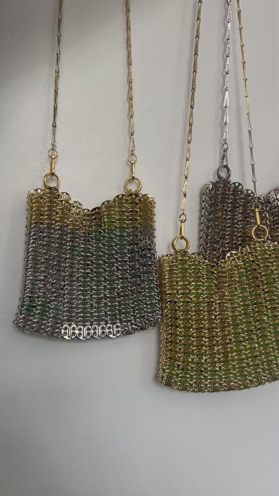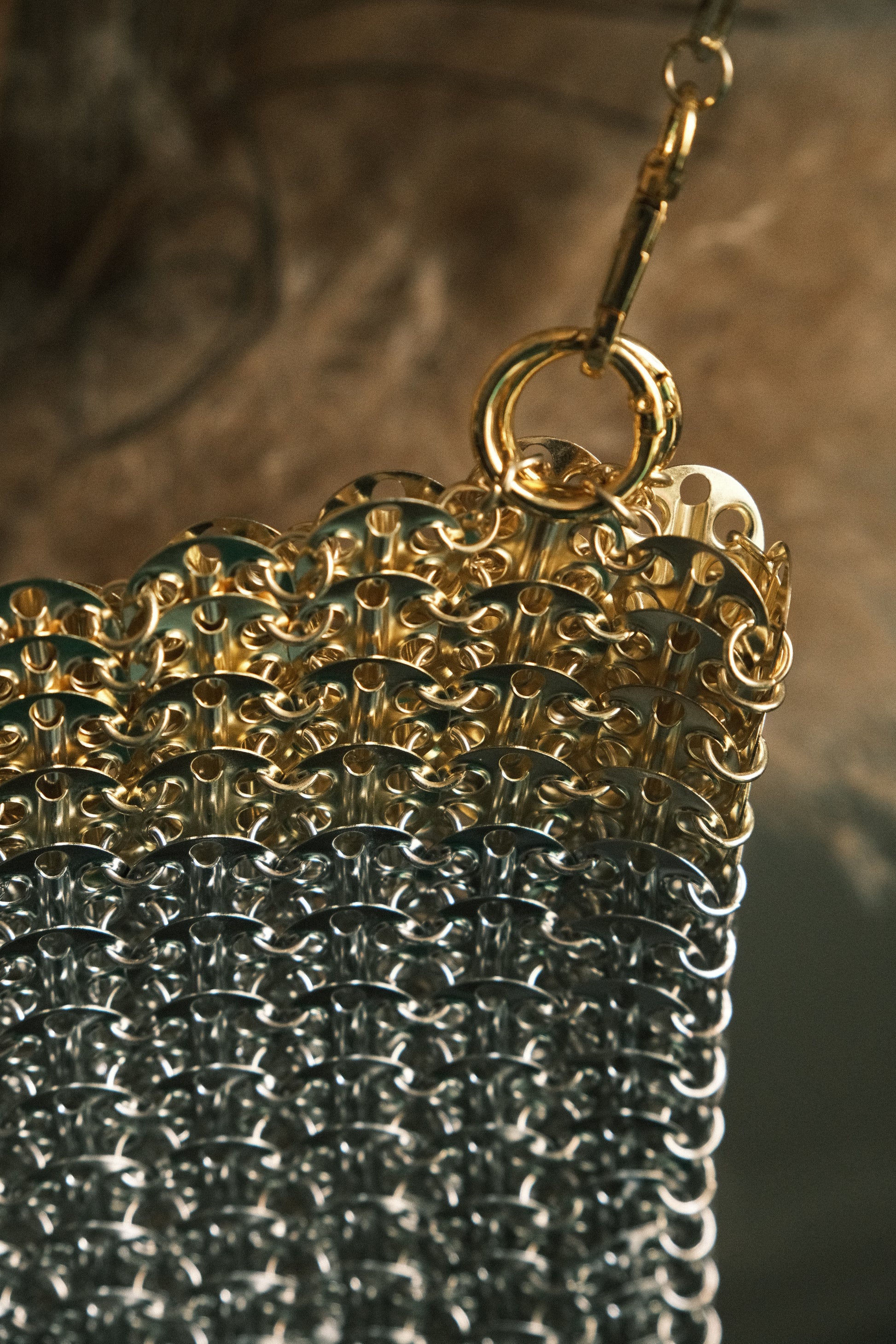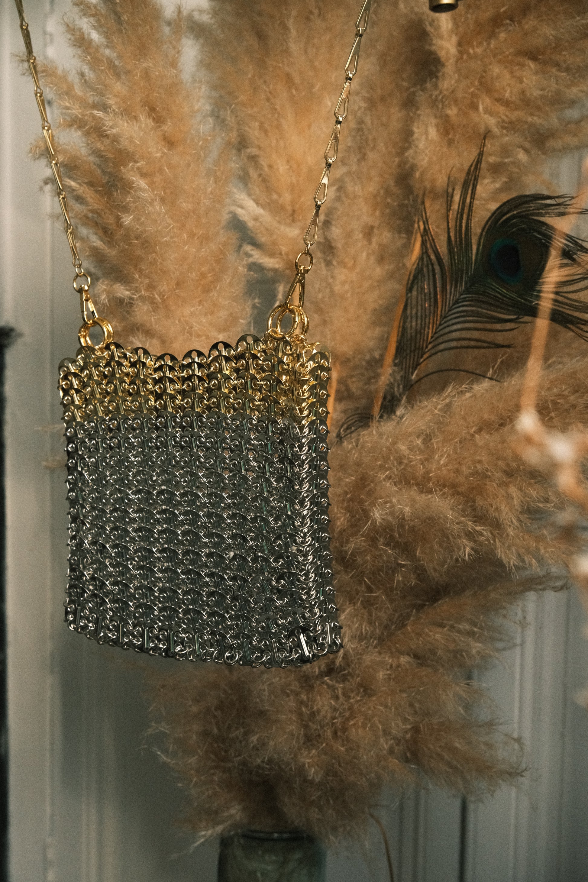Fabriqué à partir de maillons métalliques minutieusement assemblés à la main, il incarne l’alliance parfaite entre artisanat brut et esthétique avant-gardiste.