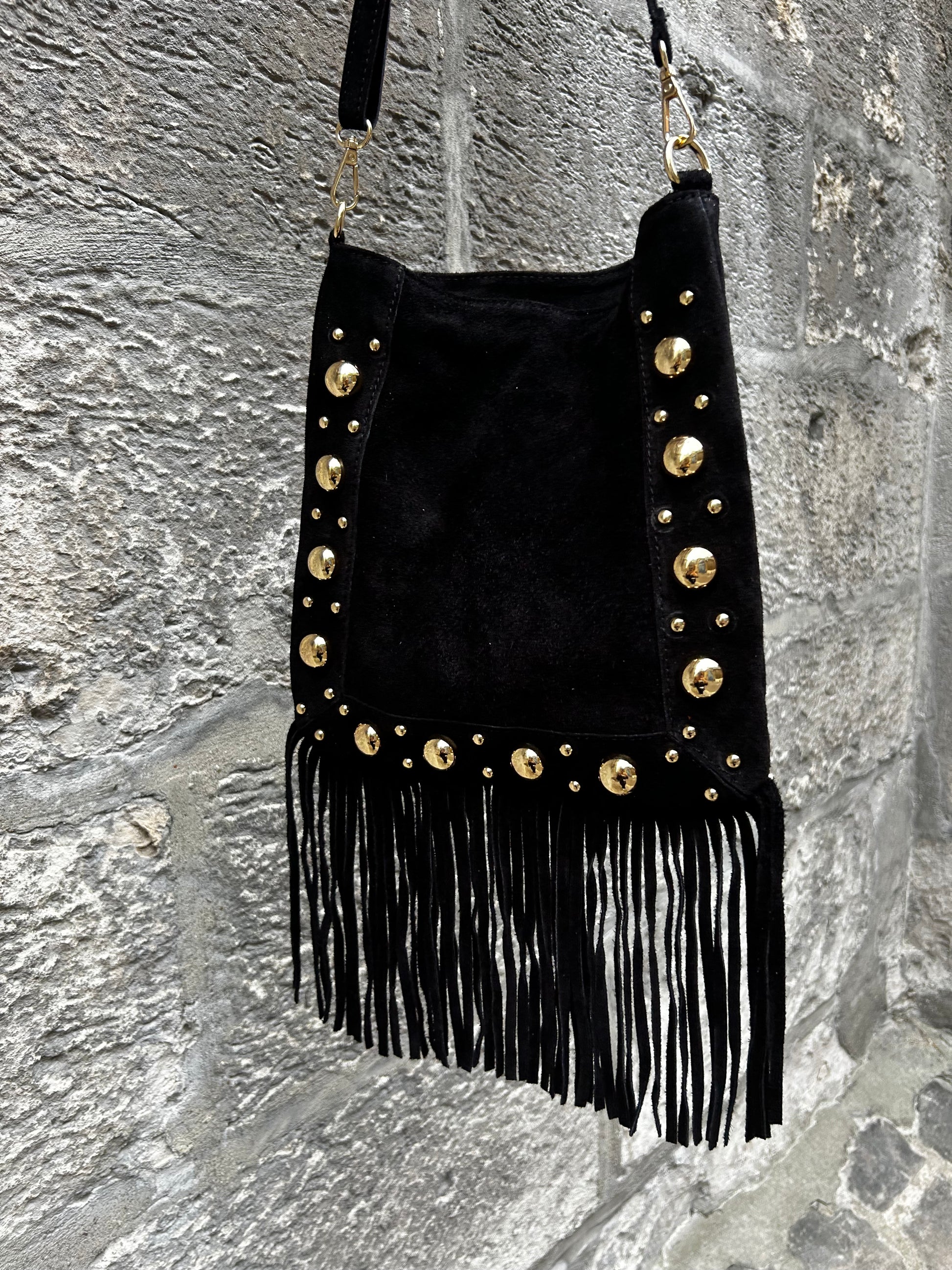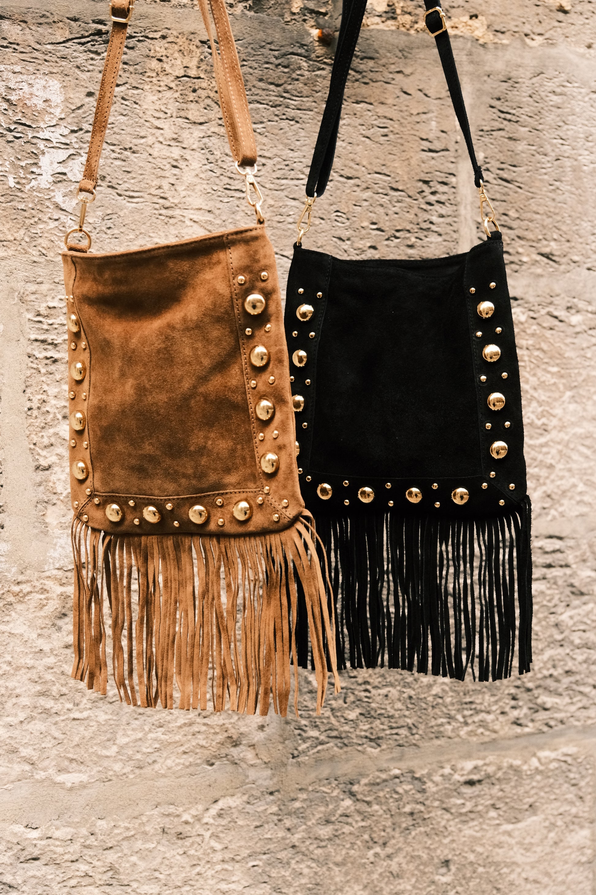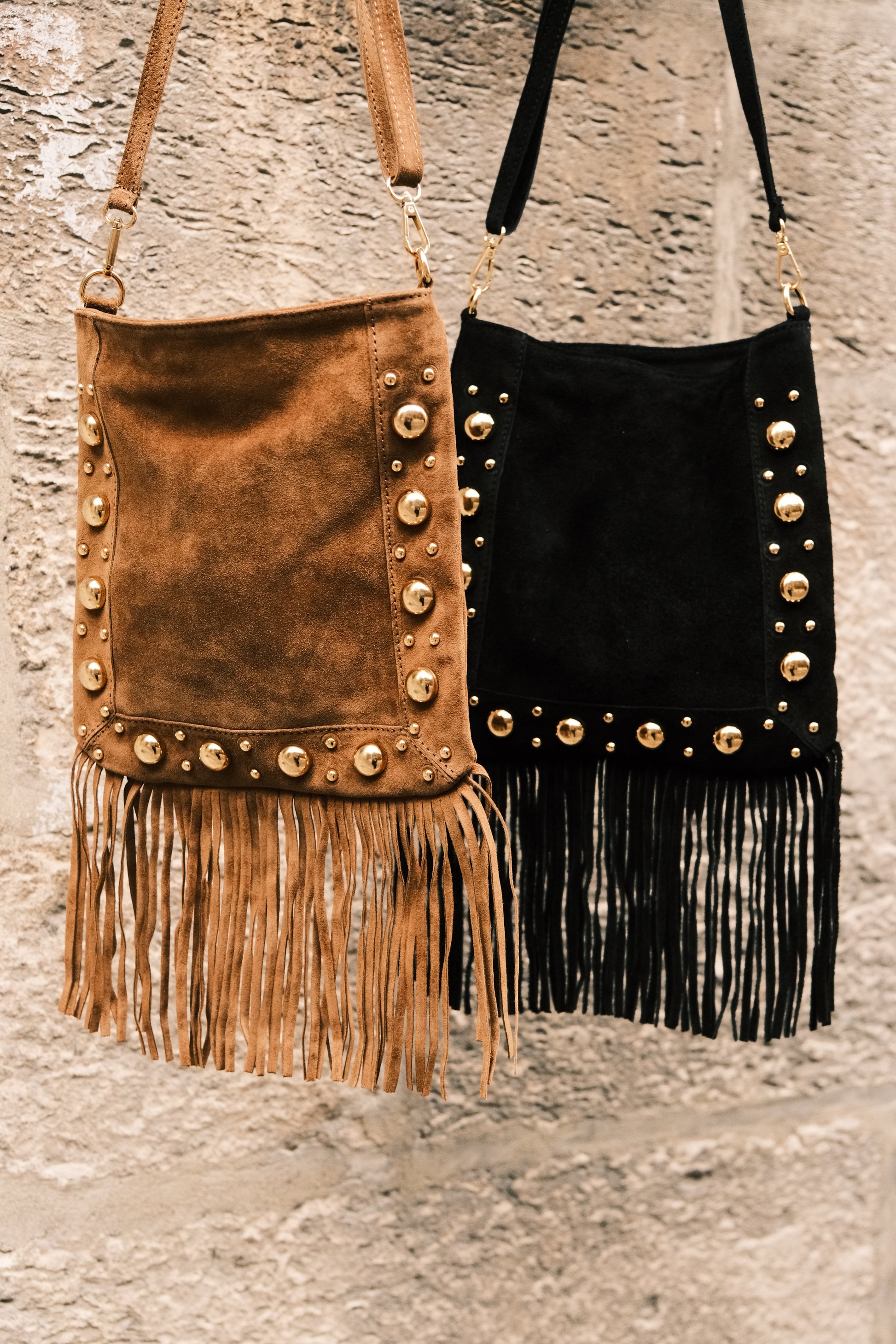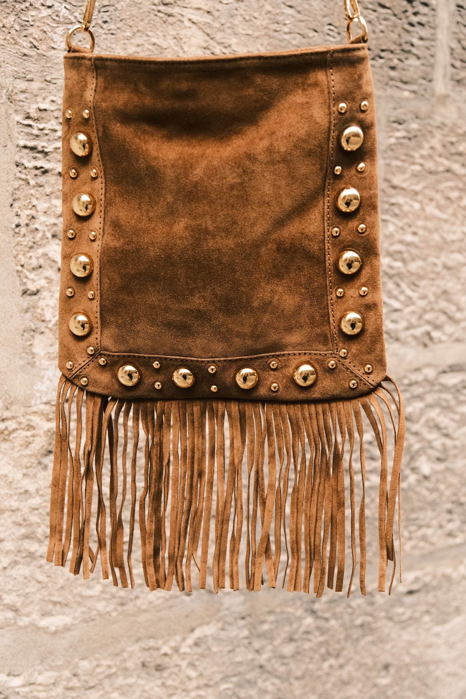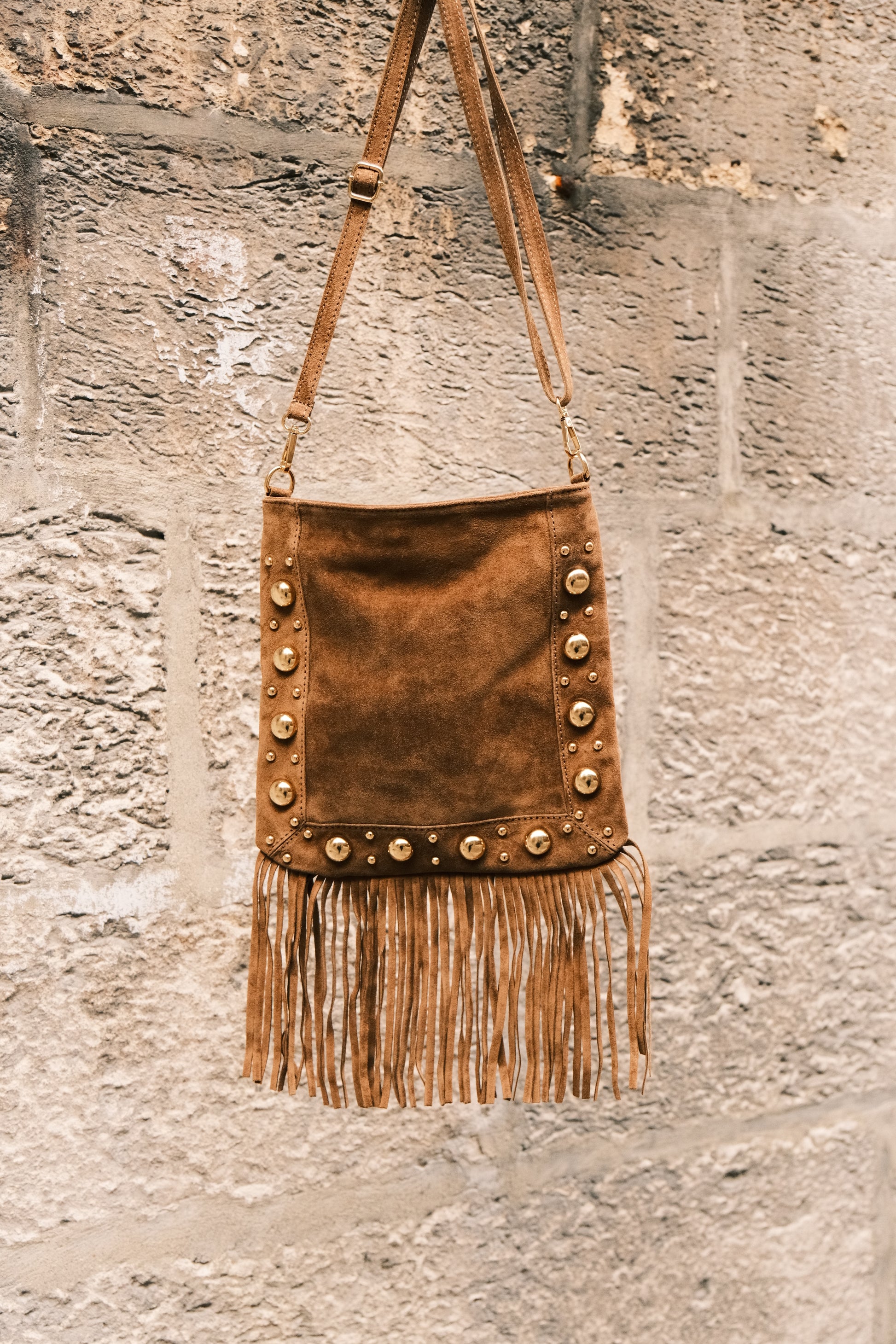 Imaginé dans un daim souple et raffiné, le sac Thérèse séduit par son caractère unique. Ses détails dorés en acier inoxydable lui apportent éclat et sophistication, tandis que ses franges délicates insufflent une touche bohème pleine de mouvement.