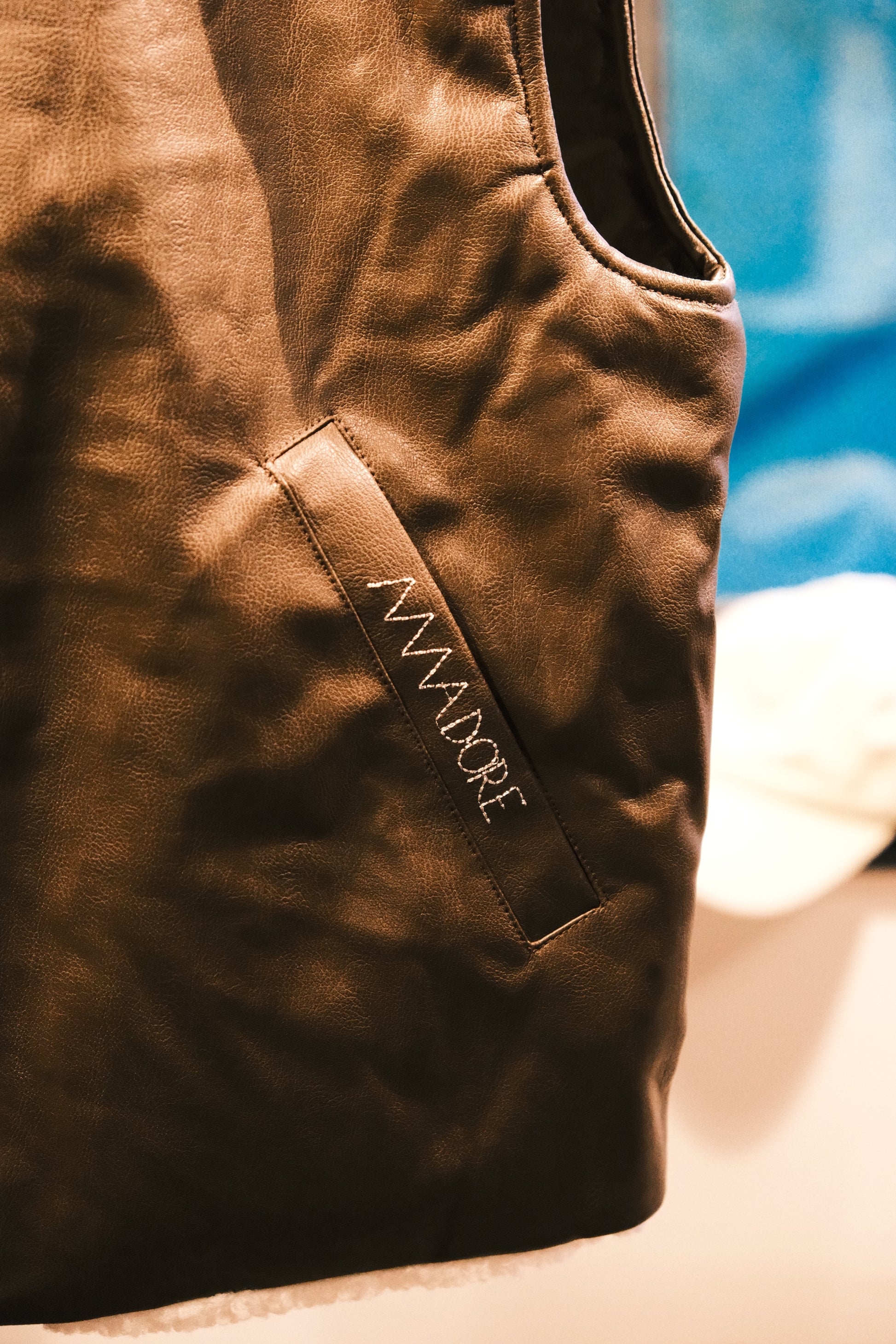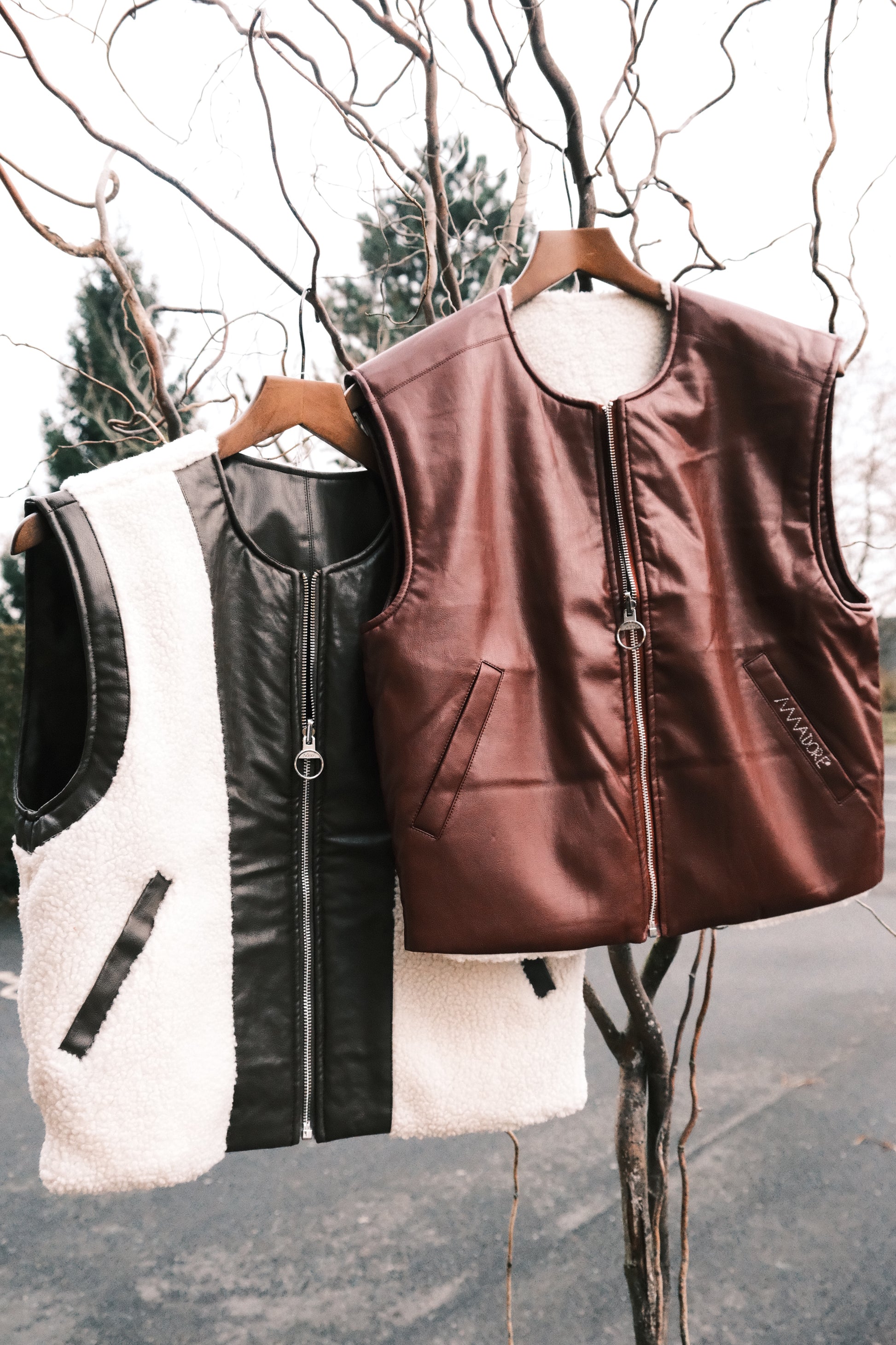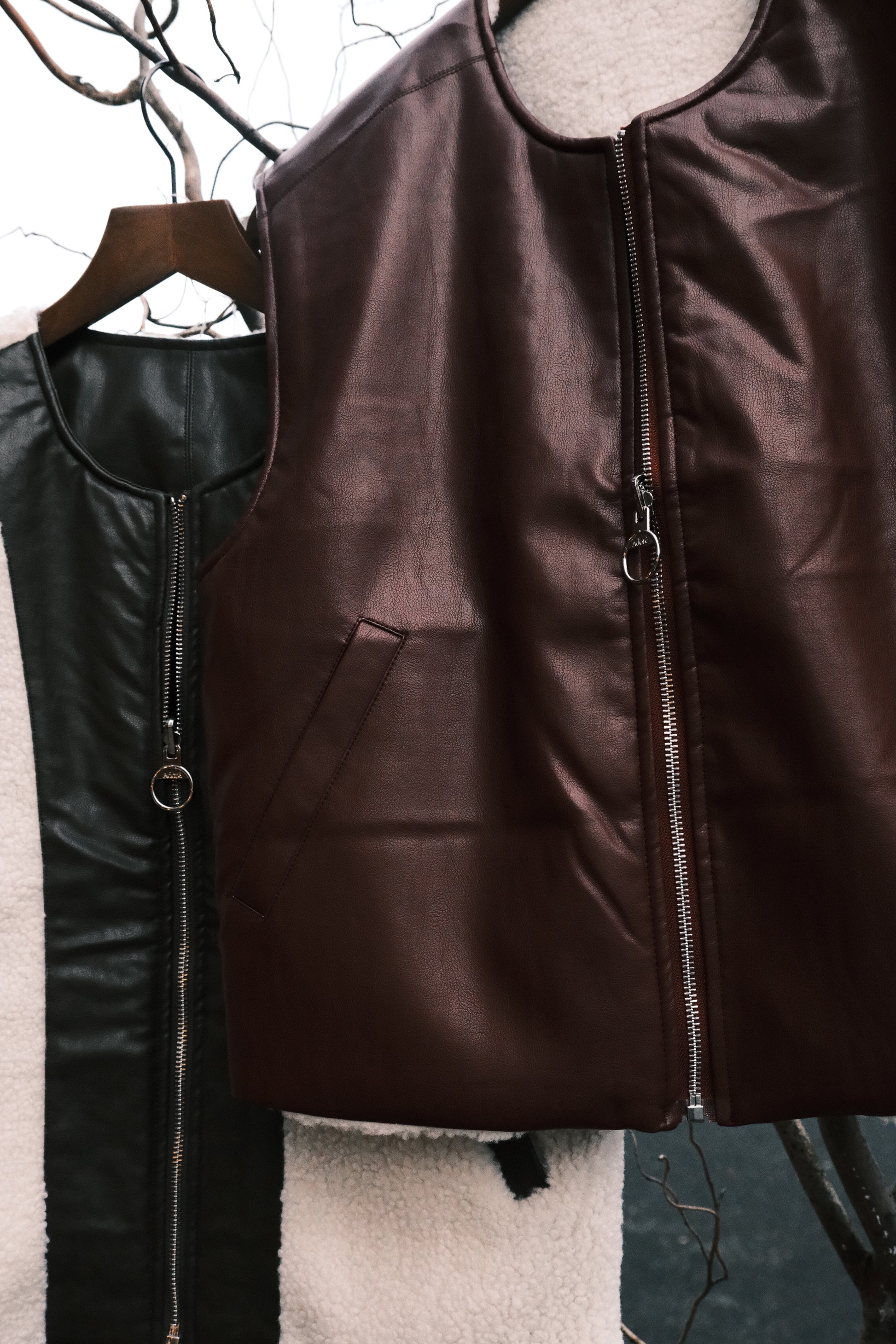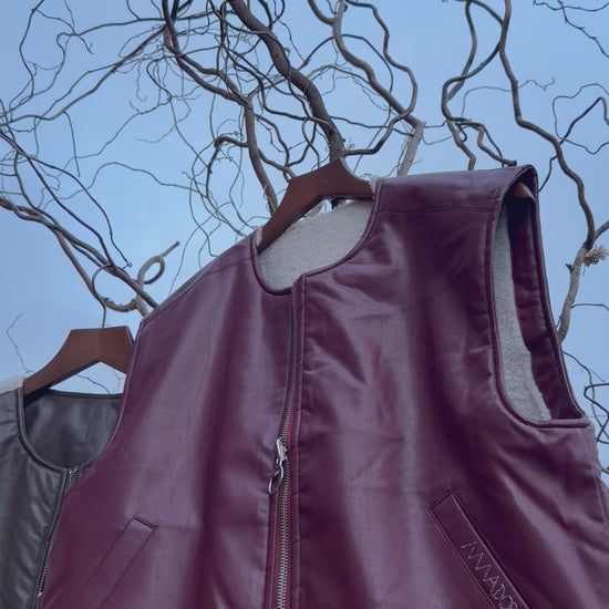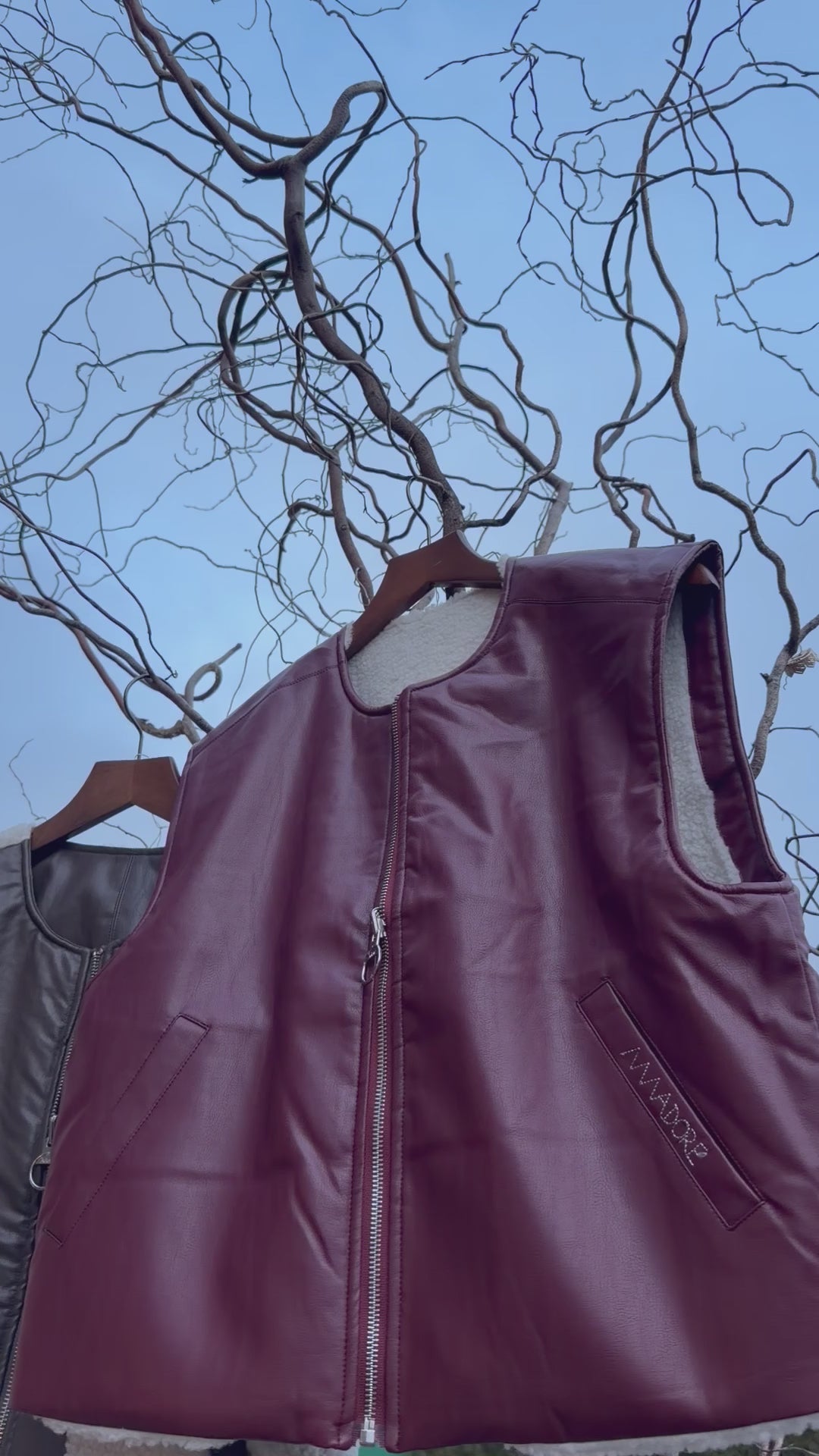 Veste réversible sans manches, en cuir souple et doublure textile. Une coupe droite et épurée, pensée pour se porter des deux côtés et s’adapter à toutes les envies.