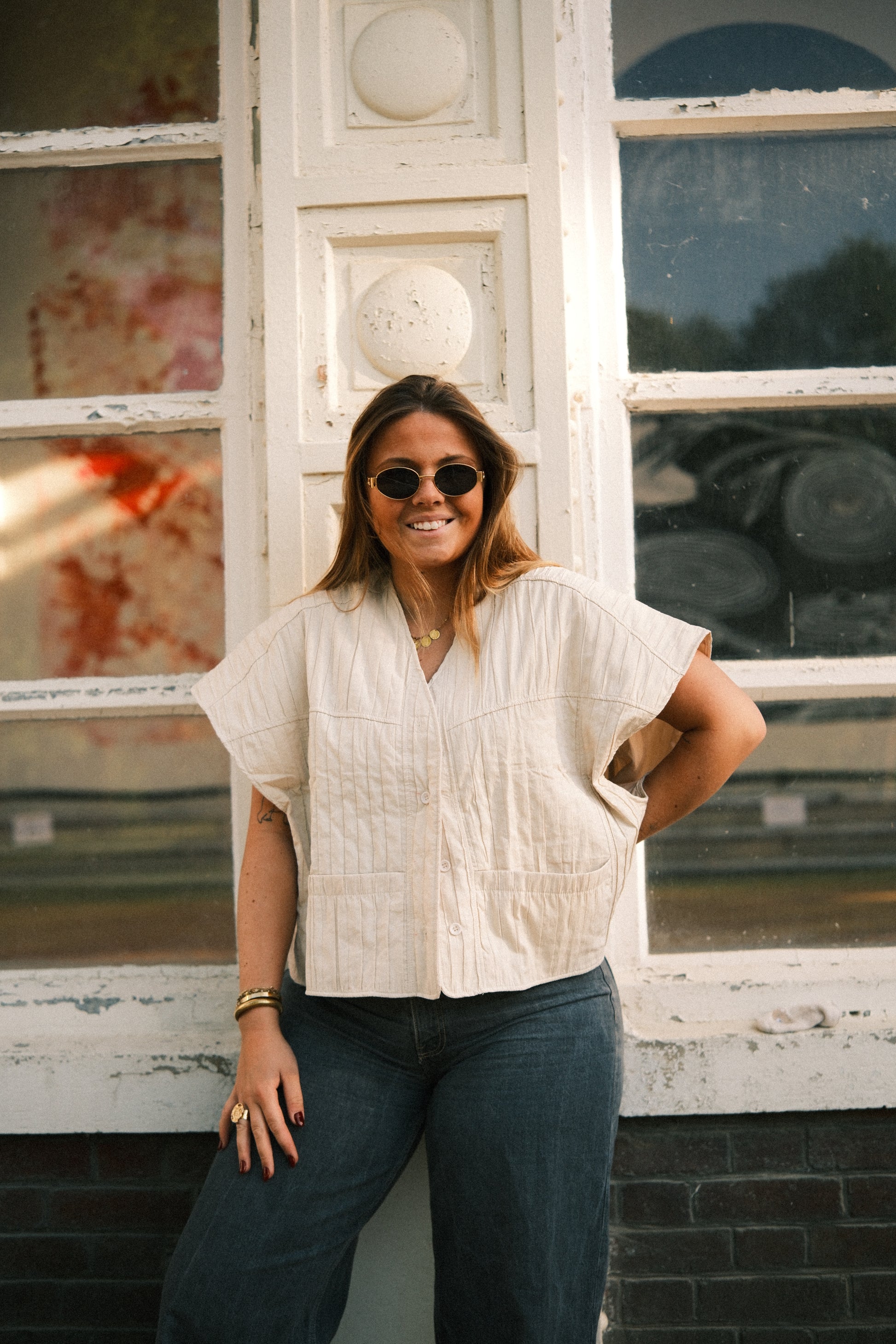 Pensée pour se superposer facilement, elle se porte aussi bien sur une chemise fluide pour un look travaillé que sur un simple bandeau, laissant les bras libres et la silhouette respirer. Chaque détail a été soigné : de sublimes coutures apparentes, des boutons choisis avec attention et une coupe parfaitement équilibrée.